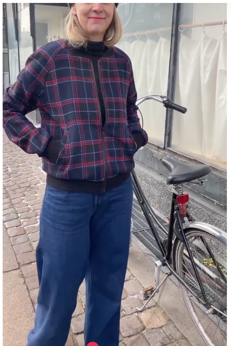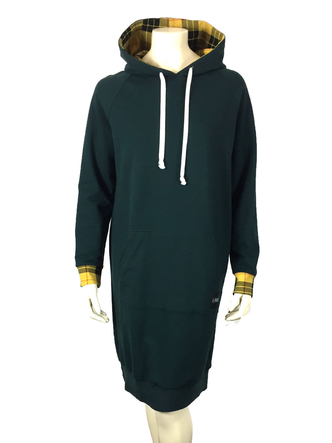 Lang grøn hættetrøje med ternede detaljer inden i hætten og med hvide snører. En lækker...