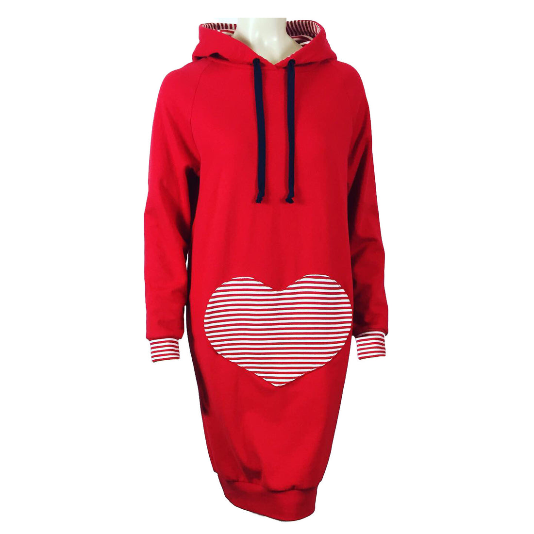 Lang rød hættetrøje med rød og hvidstribet signatur LOVE-lomme og blå snøre. En lækker all-round...
