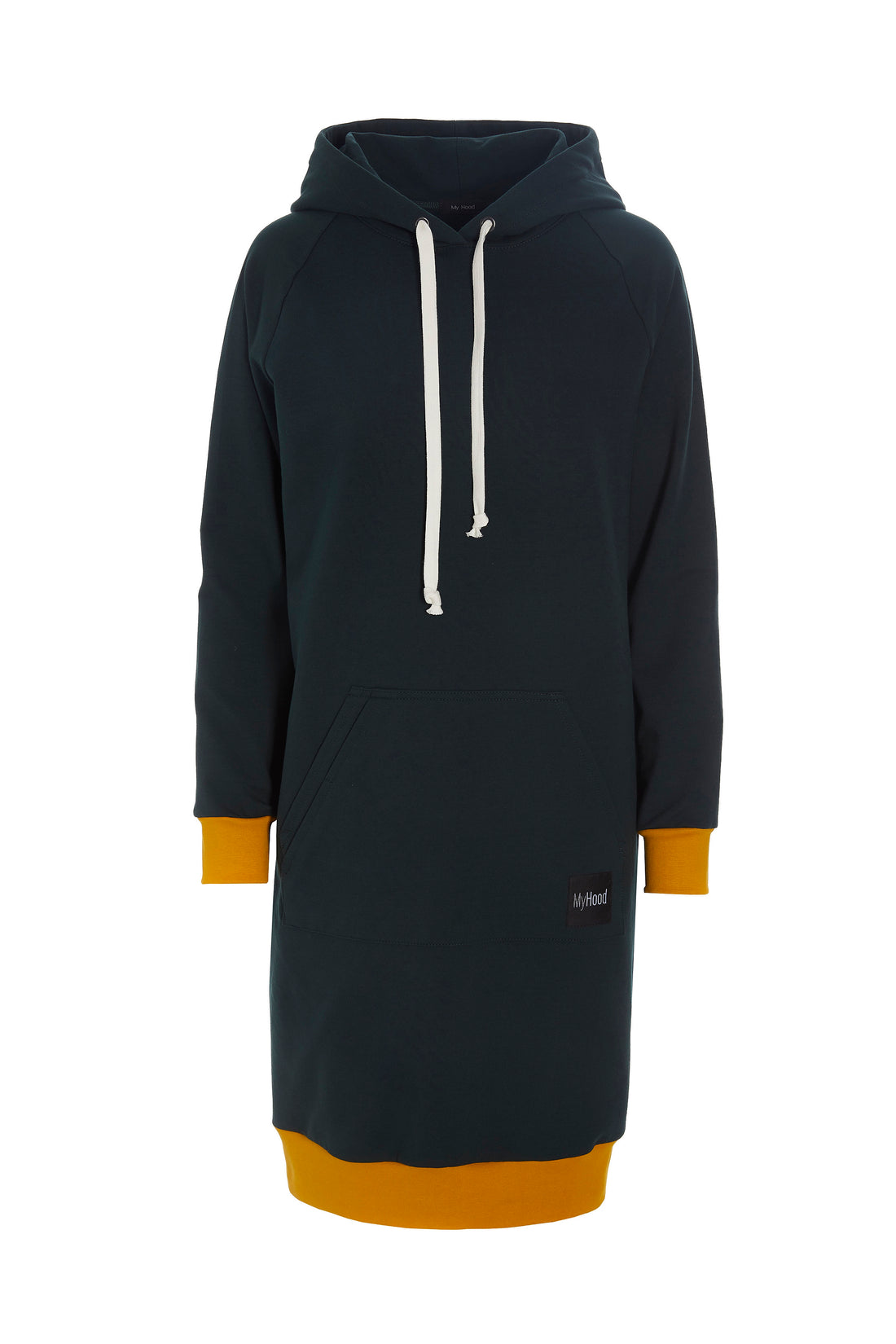 Lang økologisk hættetrøje med gule detaljer, lynlås, asymmetriske lommer og hvid snører. En perfekt all-round...