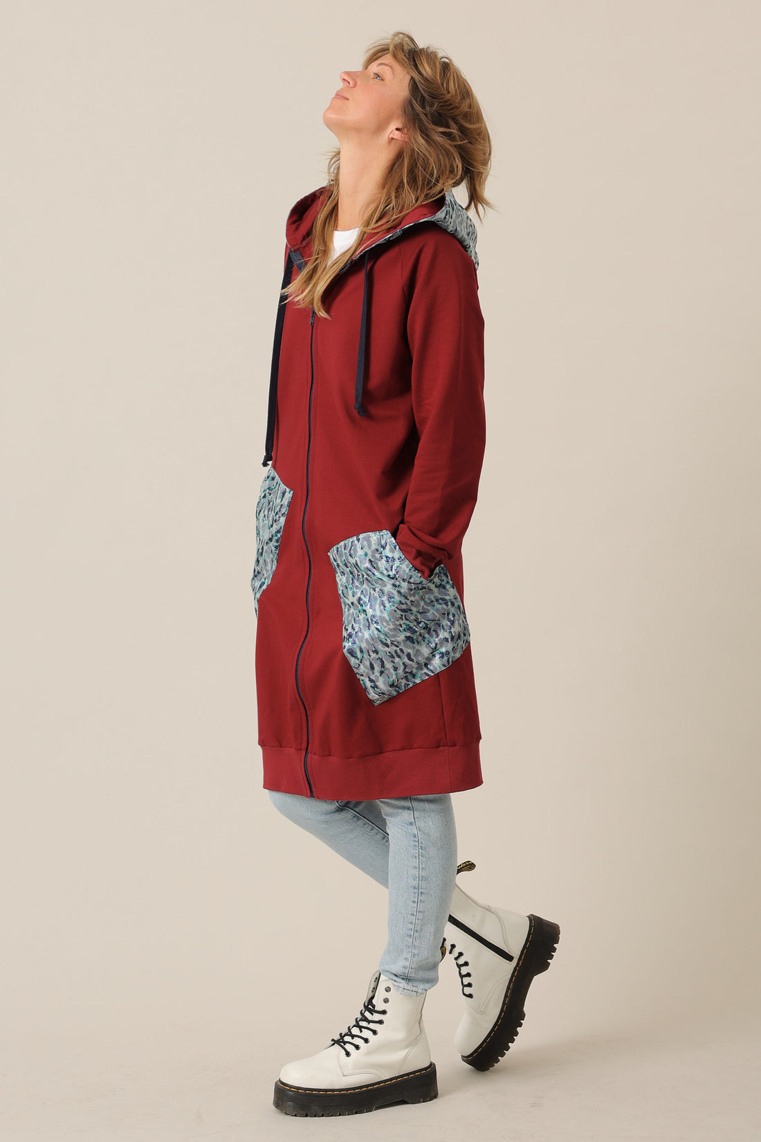 Lang bordeaux hættetrøje med lynlås, dyreprint detalje, asymmetriske lommer og blå snører. En perfekt all-round...