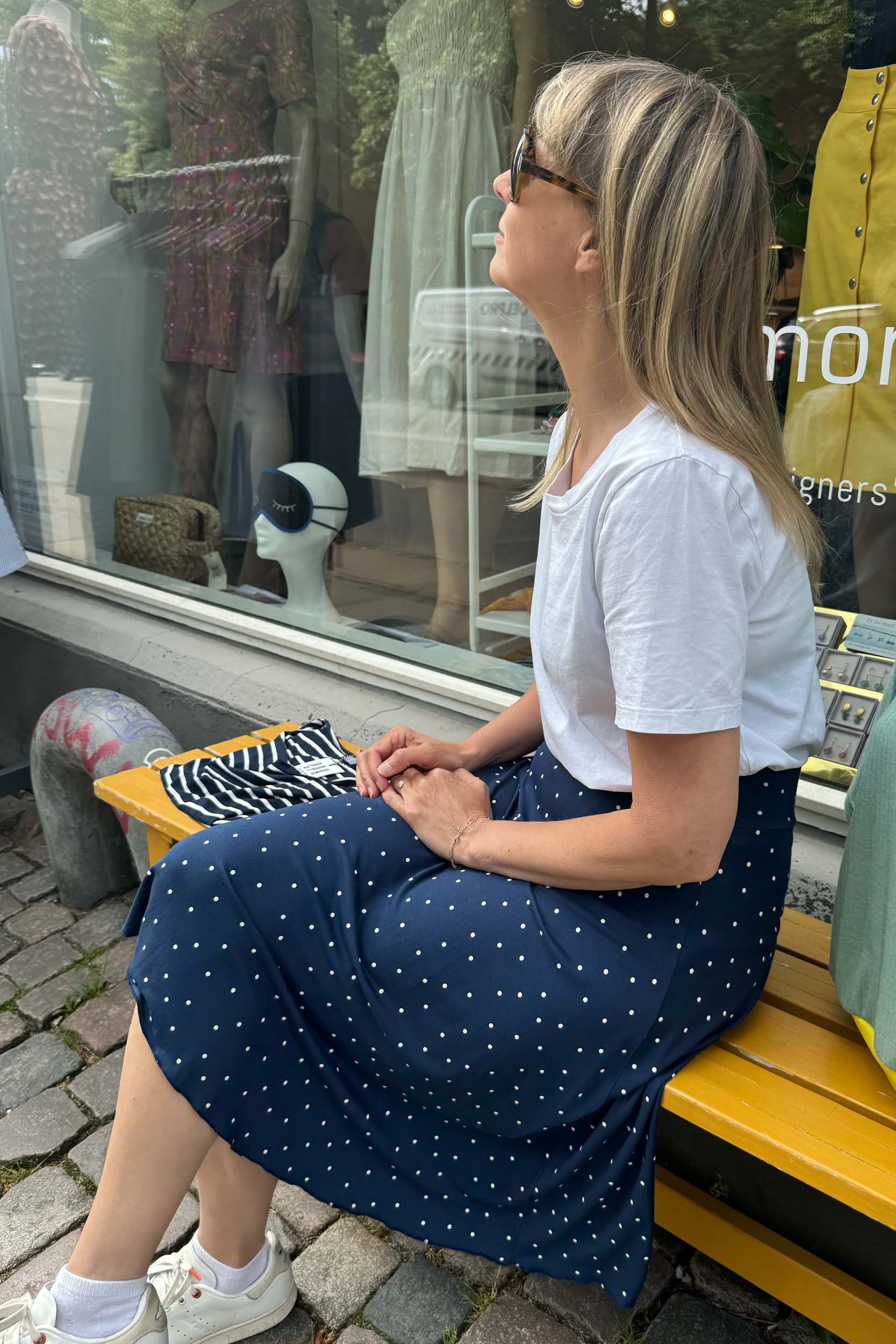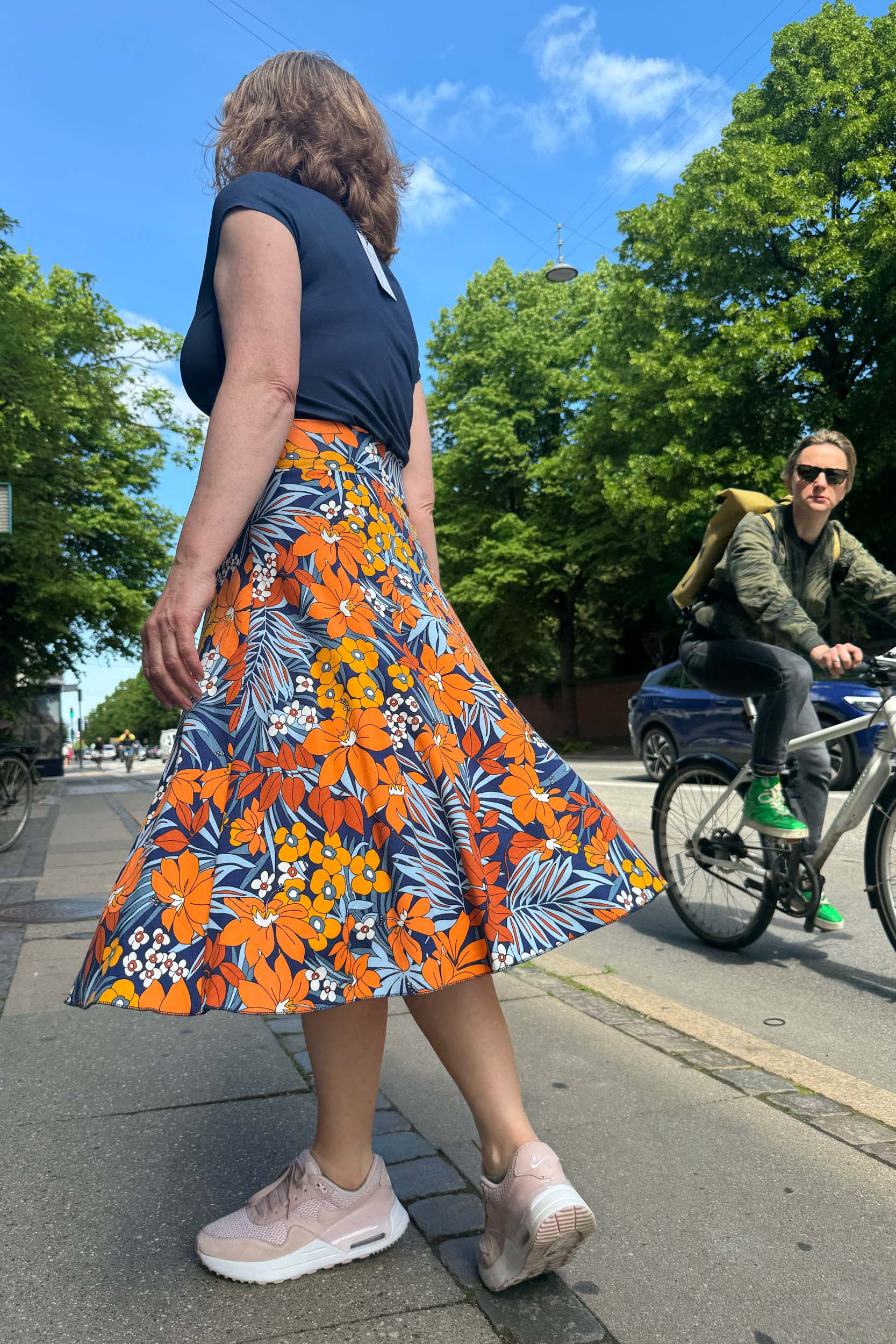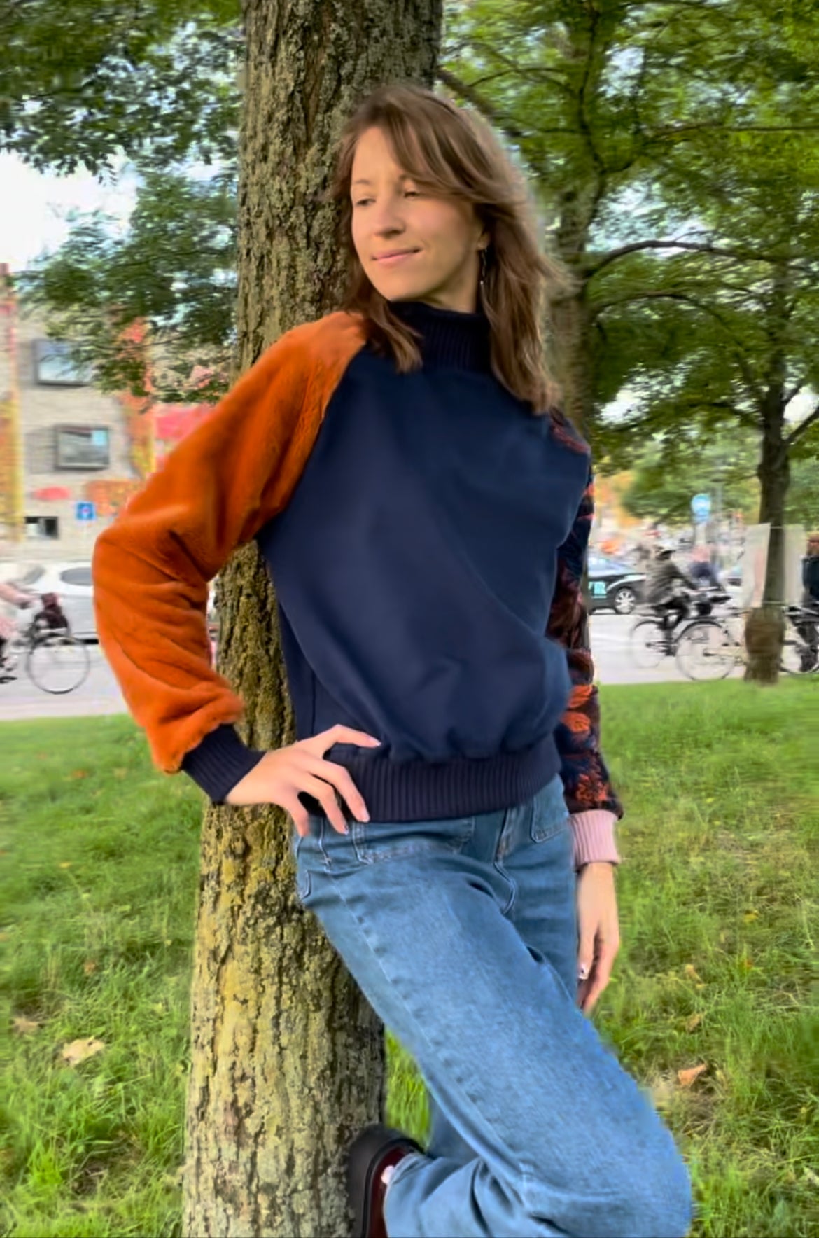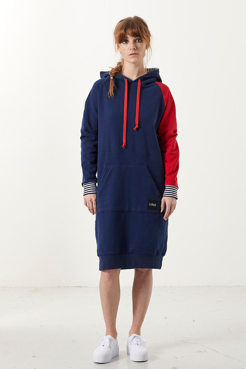 Lang blå hættetrøje med rødt ærme, signaturlomme og røde snører. Materiale: 90% økologisk bomuld (GOTS),...
