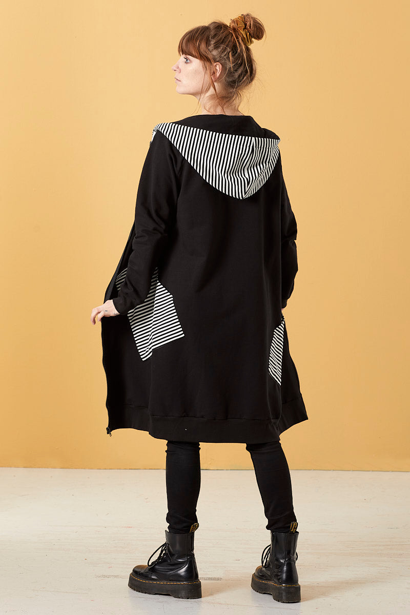 Økologisk sort lang hættetrøje med stribede detaljer, lynlås, asymmetriske lommer og hvide snører. En perfekt...