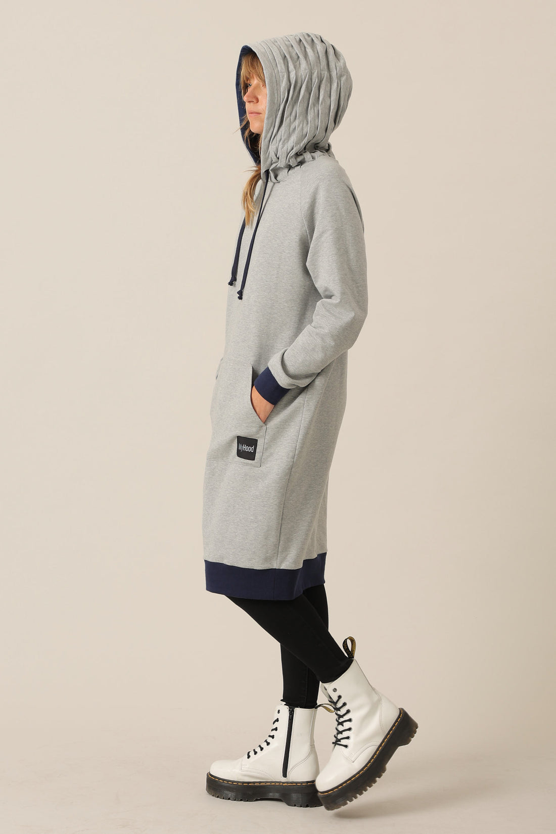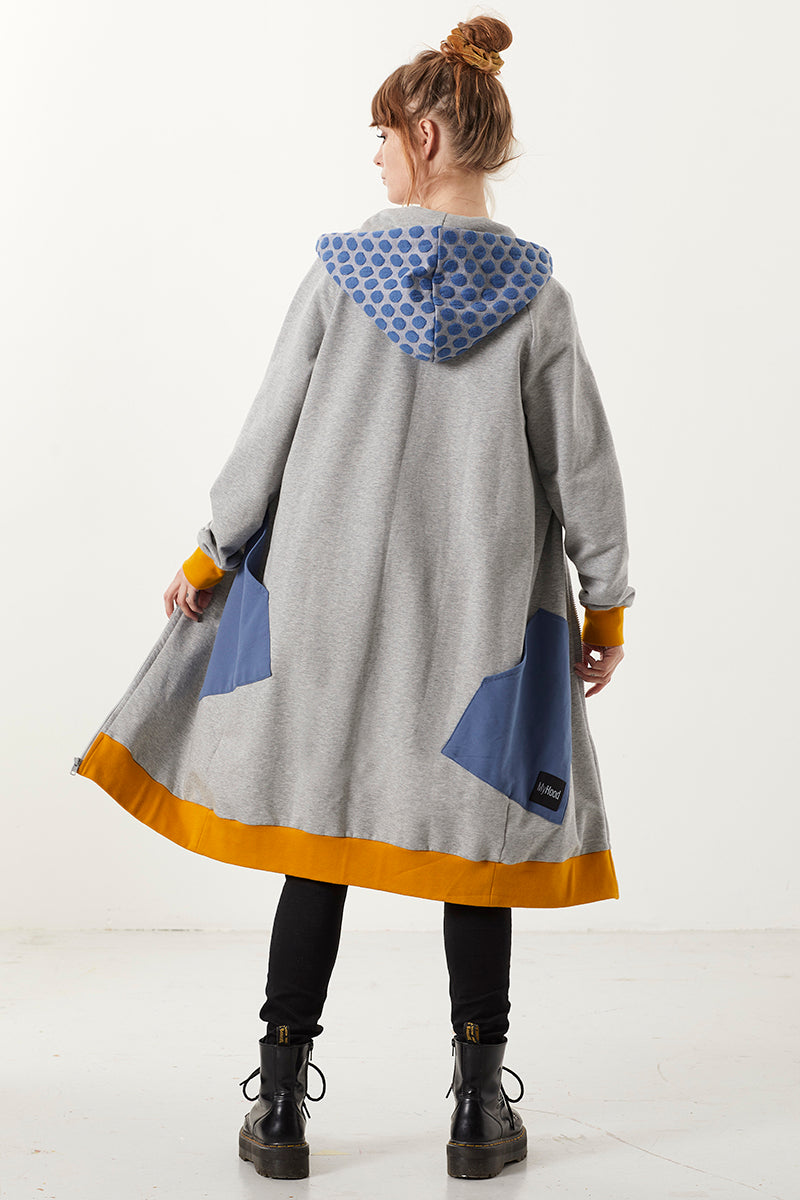 Lang grå hættetrøje med blåt ærme, signaturlomme og blå snører. Obs hætten er lidt anderledes...