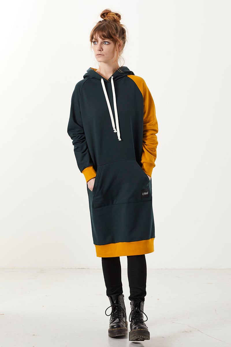 Lang grøn hættetrøje med karrygul ærme, signaturlomme og hvide snører. Materiale: 90% bomuld, 5% elastan,...