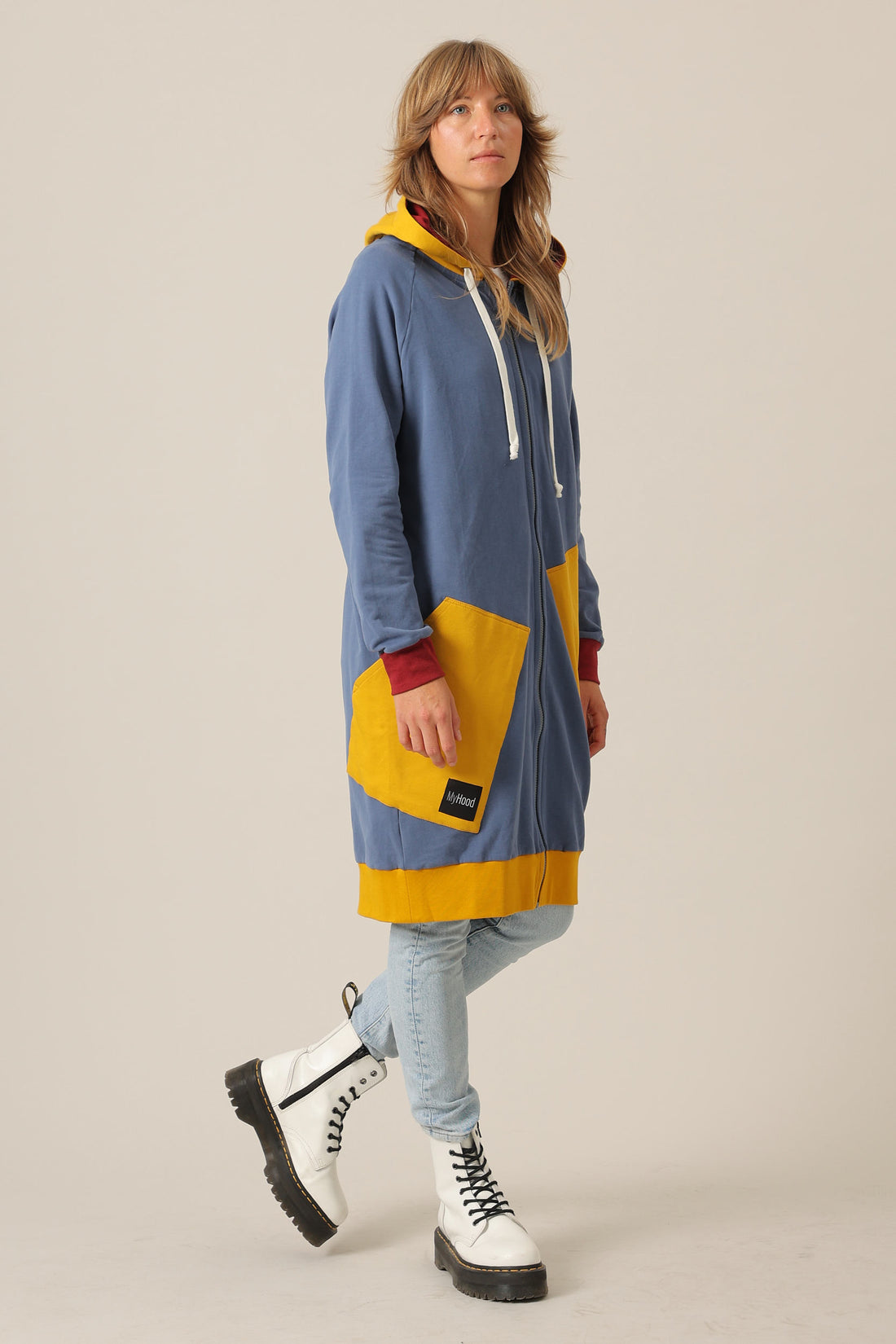 Lang økologisk hættetrøje med gule detaljer, lynlås, asymmetriske lommer og hvid snører. En perfekt all-round...