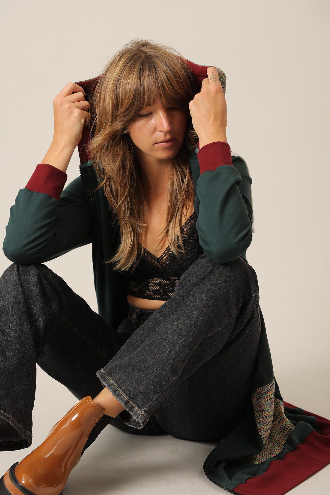 Lang grøn hættetrøje med lynlås, neopren detalje, asymmetriske lommer og hvide snører. En perfekt all-round...