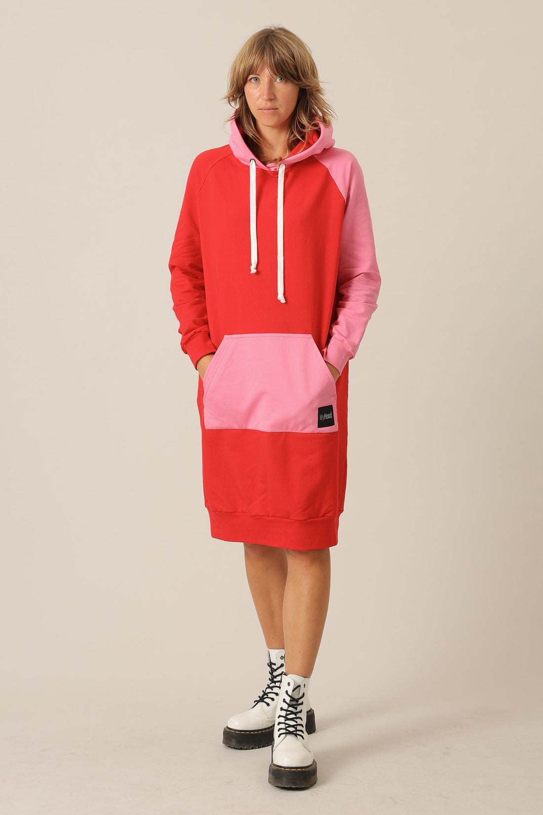 Lang rød hættetrøje med signaturlomme, pink detaljer og hvid snører. En lækker all-round hættetrøje. Du...