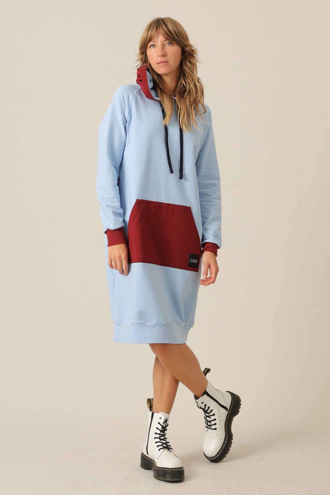 Lang lyseblå hættetrøje med signatur lomme, bordeaux detaljer og mørkeblå snører. En lækker all-round...