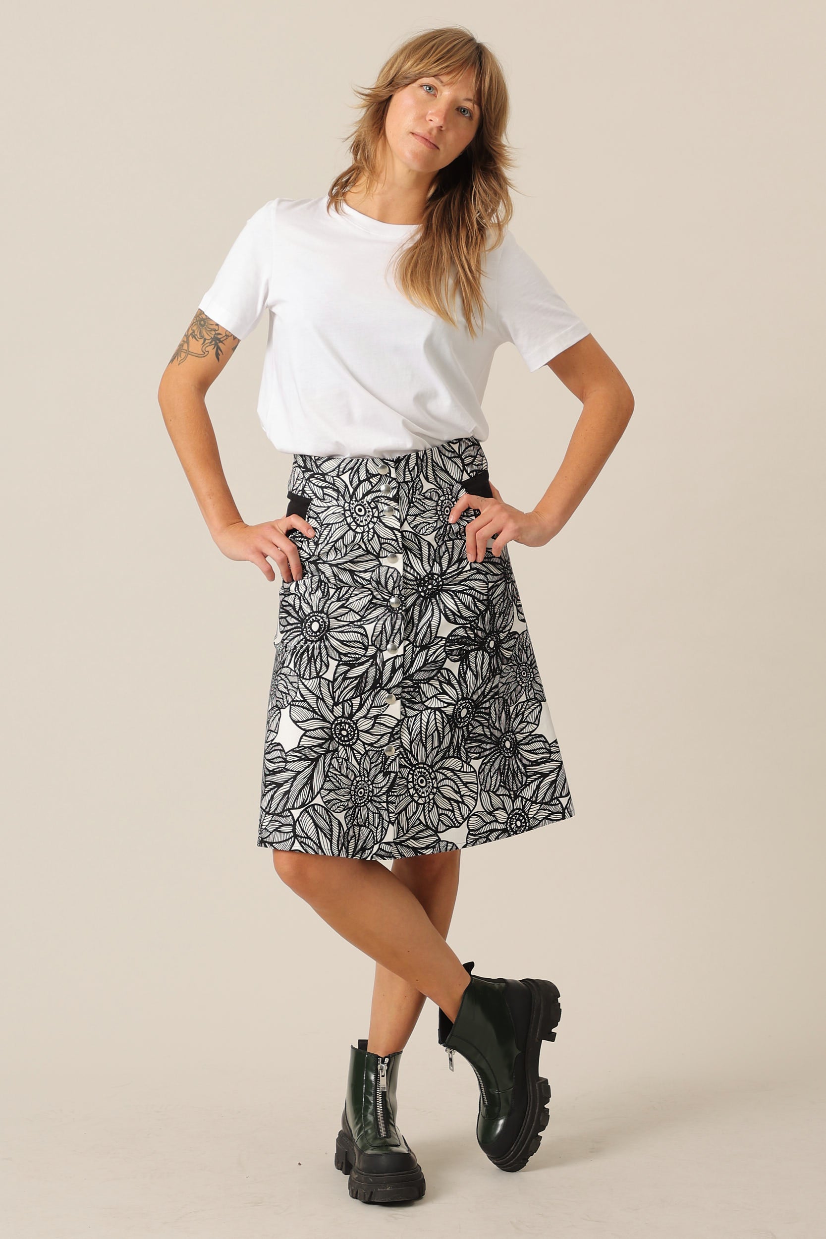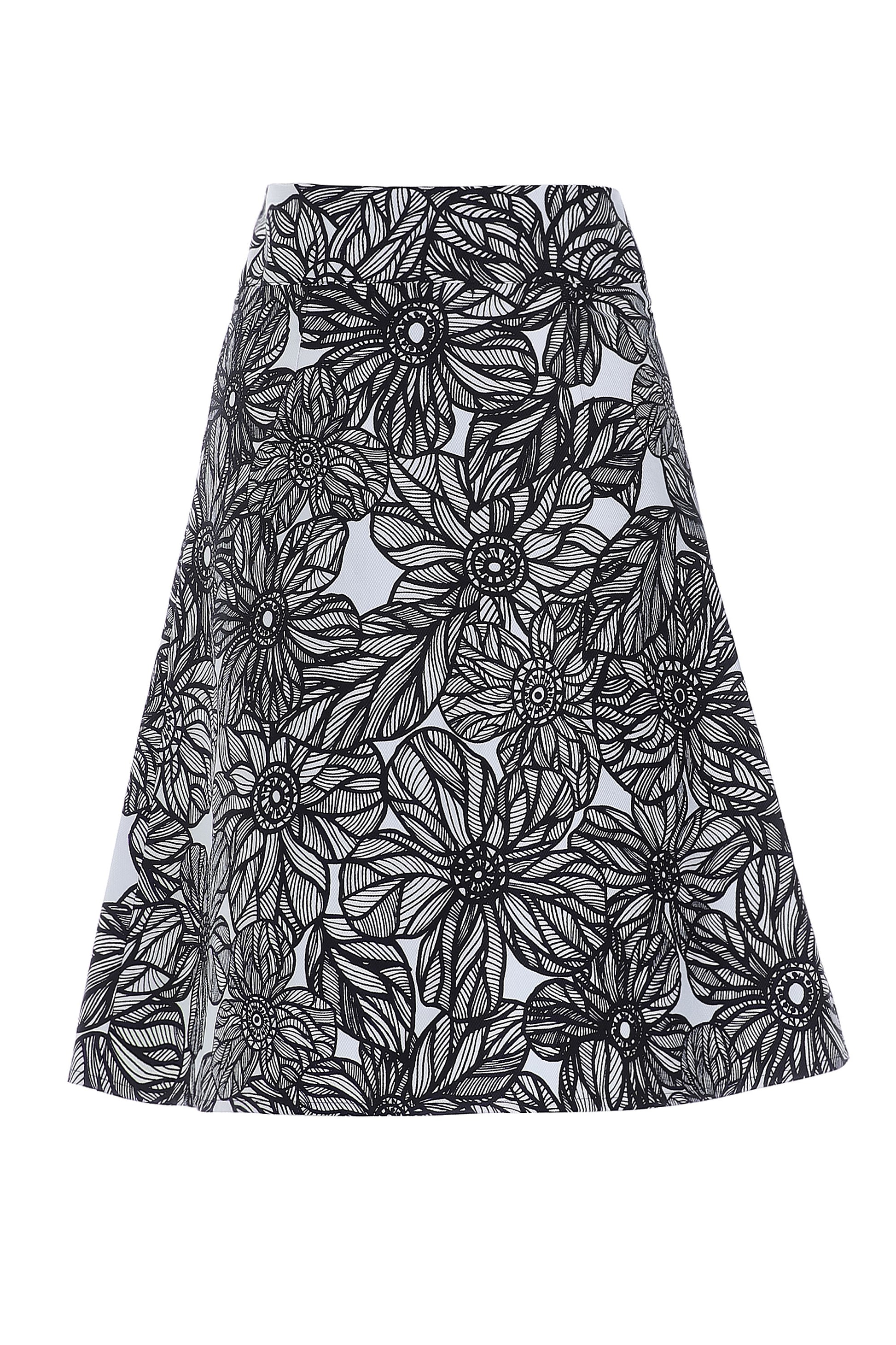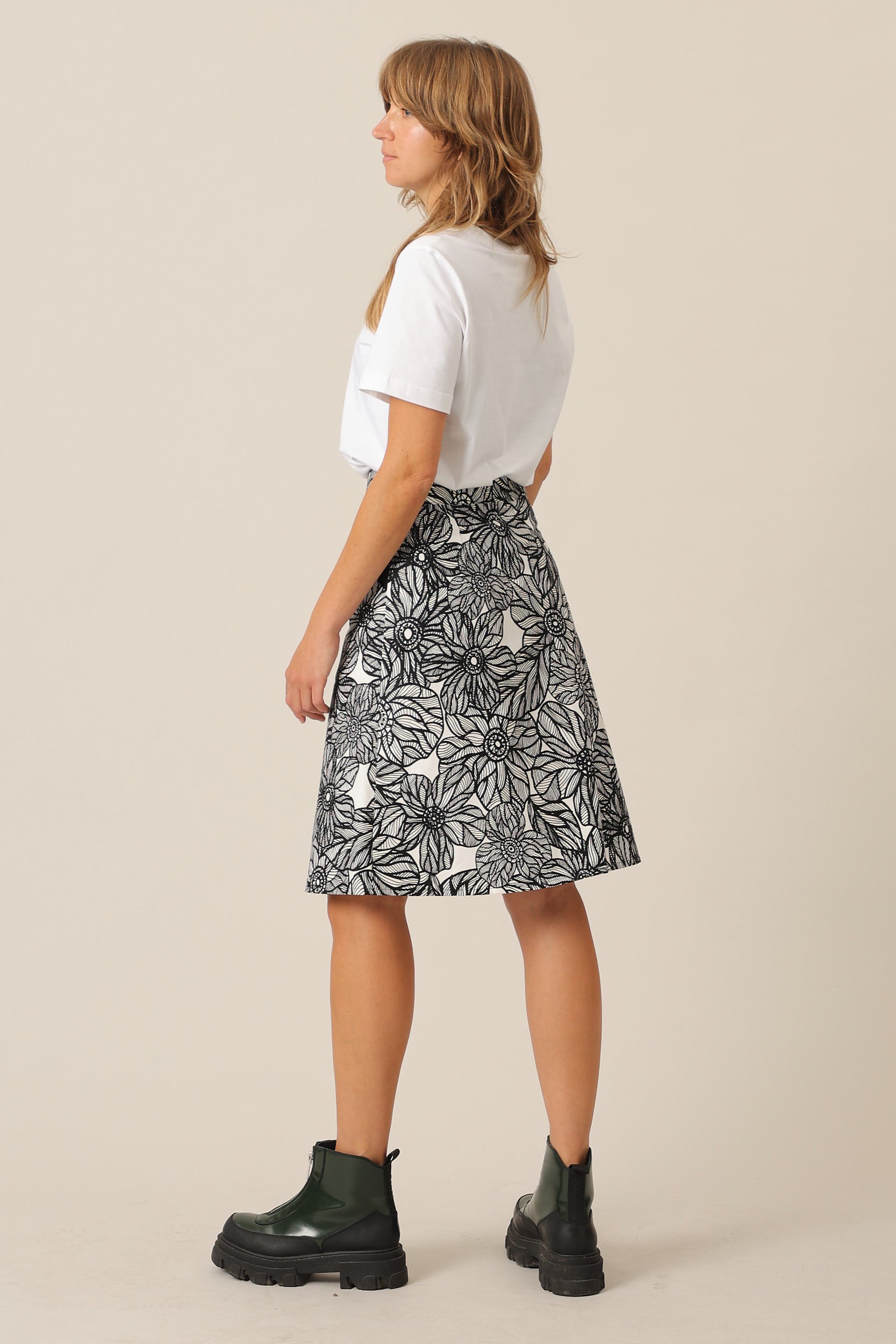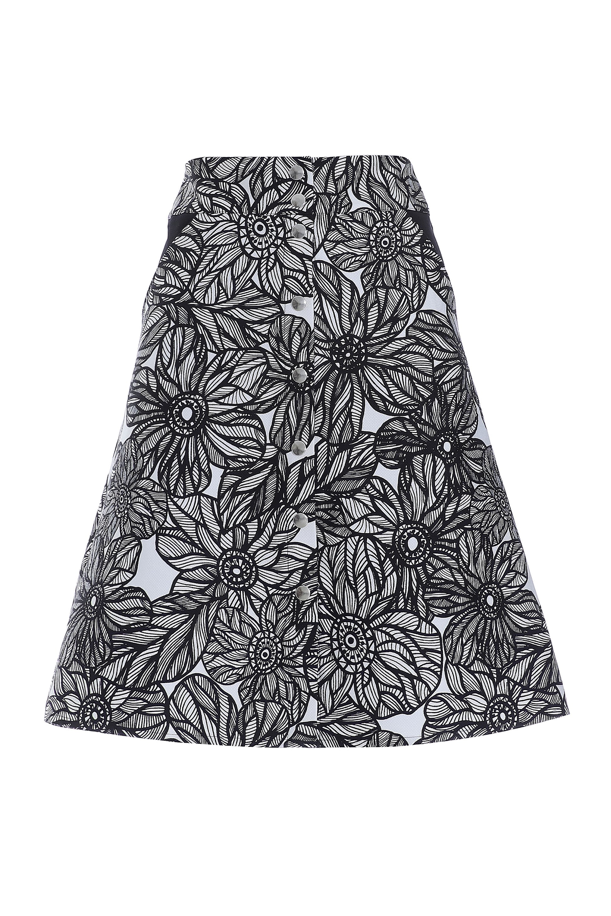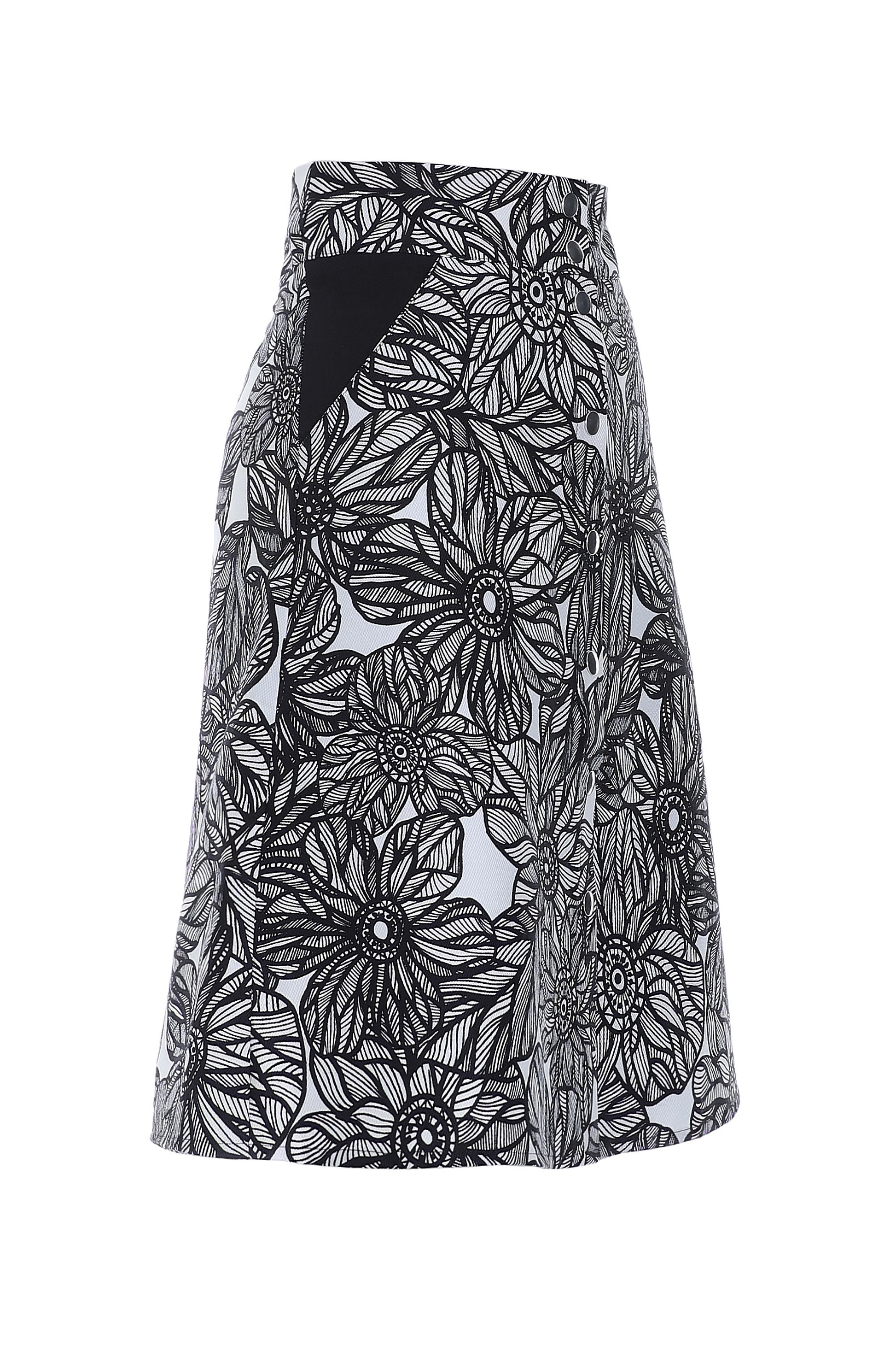 A-formet nederdel i sort og hvid blomsterprint. Den er højtaljet, har lommer og lukkes den flotte metal trykknapper. En allround nederdel, perfekt til både hverdag og fest.