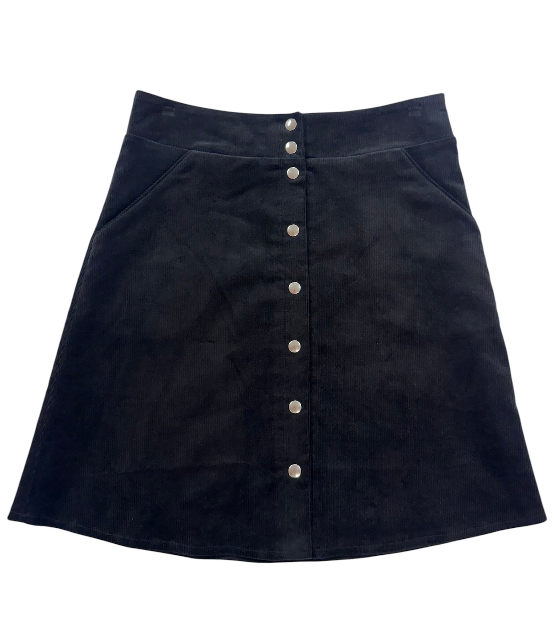A-formet nederdel i sort bomuldsfløjl, et rigtig 70'er ikon. Den er højtaljet, har lommer og lukkes den flotte metal trykknapper. En allround nederdel, perfekt til både hverdag og fest.