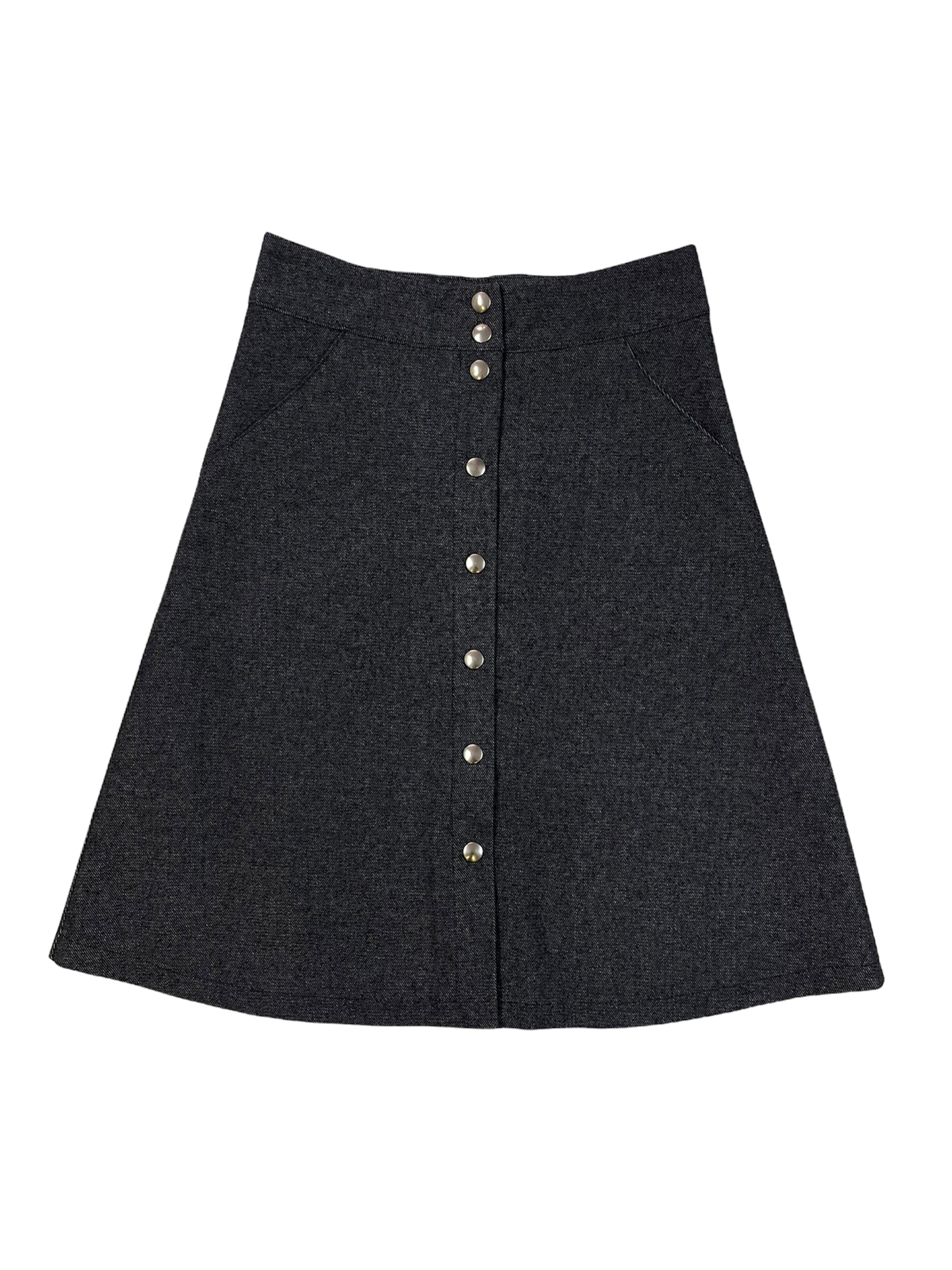 A-formet nederdel i uldblanding. Den er højtaljet, har lommer og lukkes den flotte metal trykknapper. En allround nederdel, perfekt til både hverdag og fest.