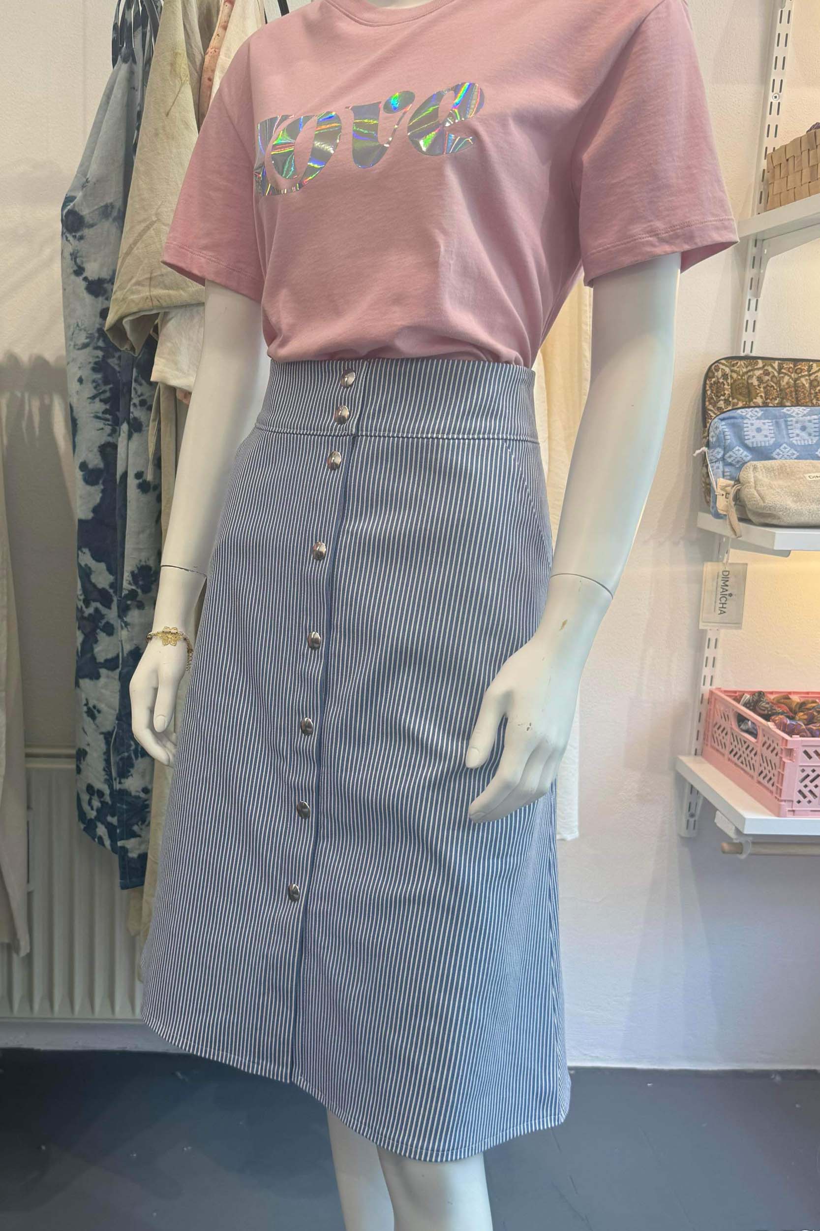 A-formet nederdel i de fineste striber! Den er højtaljet, har lommer og lukkes den flotte metal trykknapper. En allround nederdel, perfekt til både hverdag og fest.