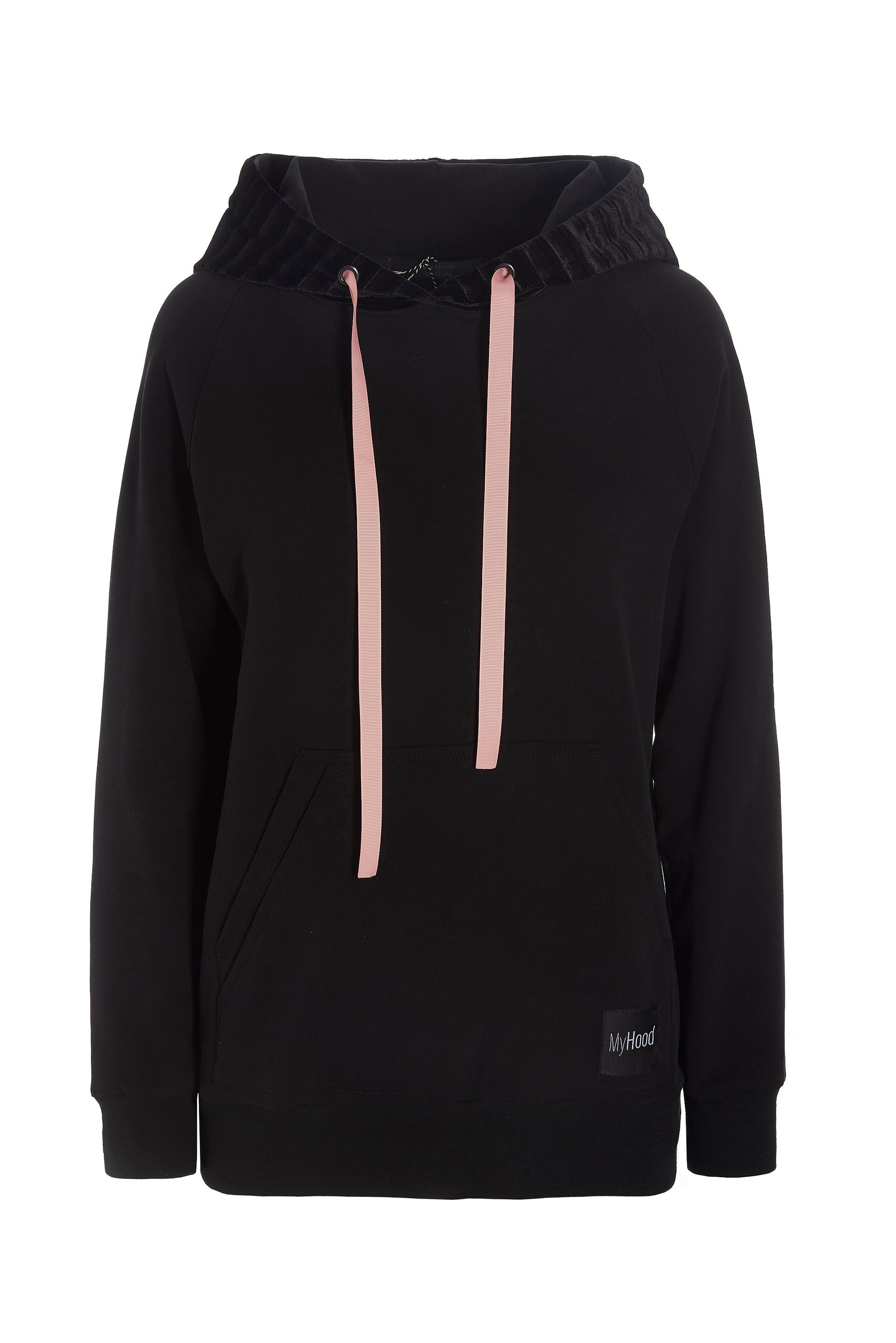 Sort hoodie med signatur lomme, plisseret sort velour hætte og lyserøde bånd