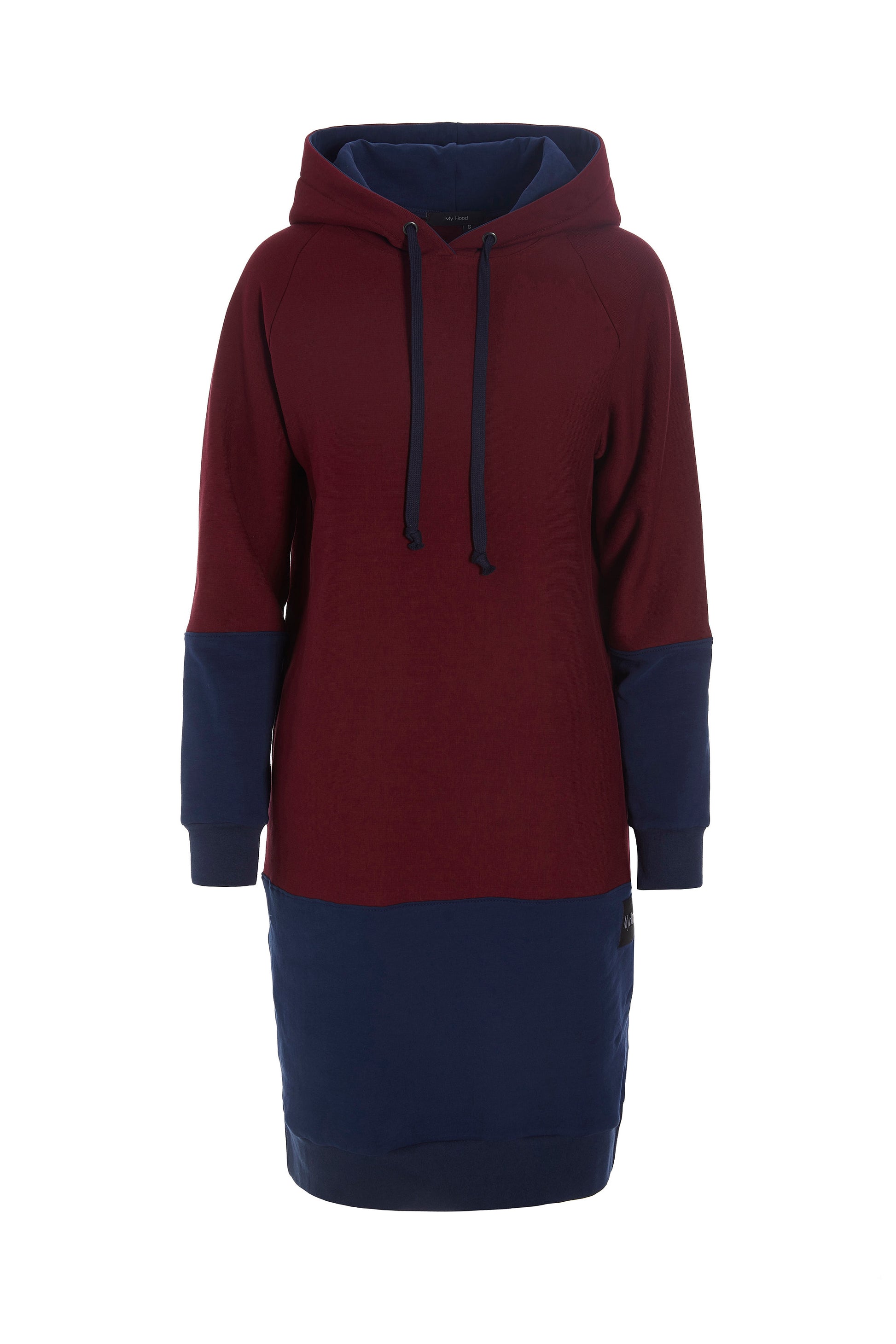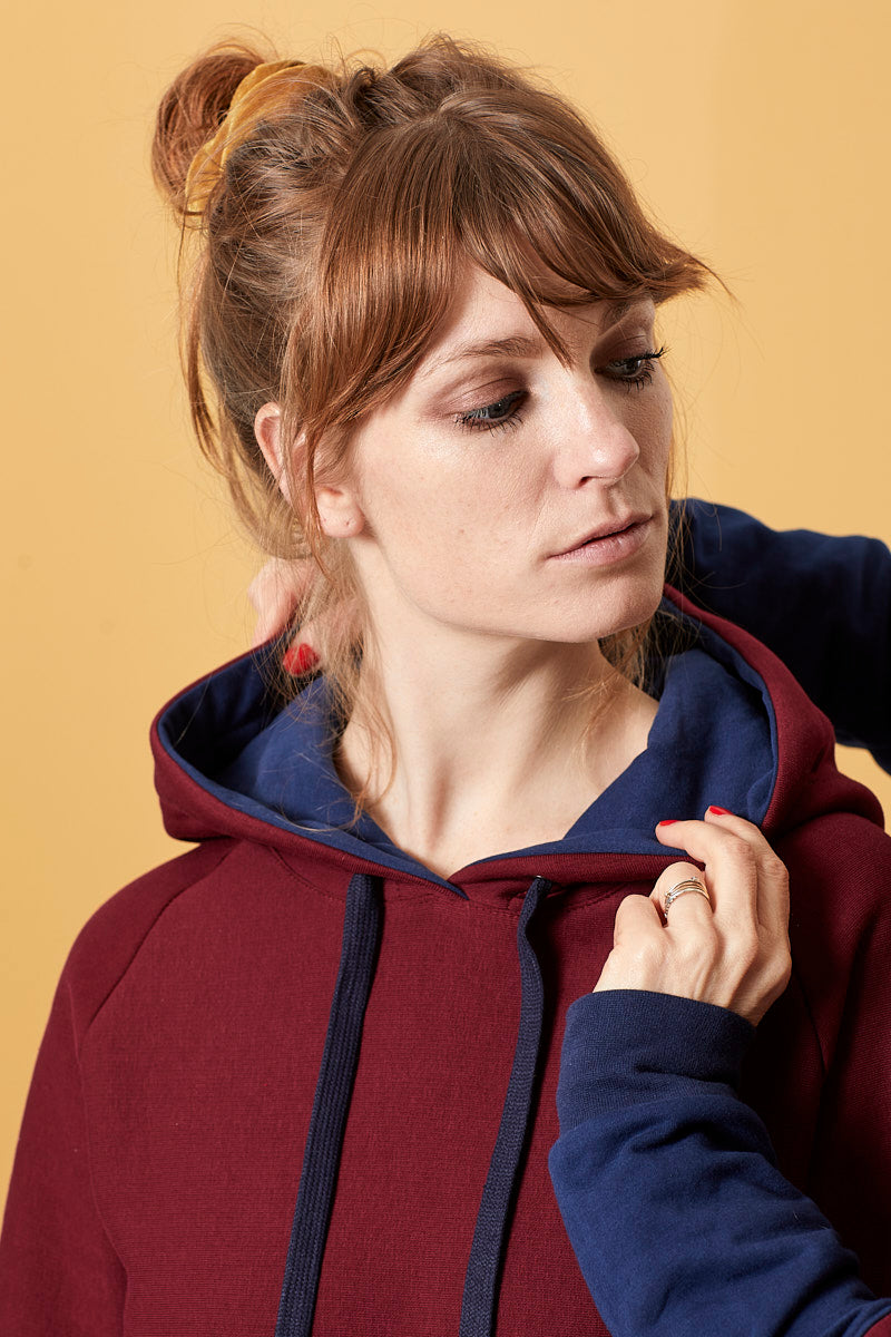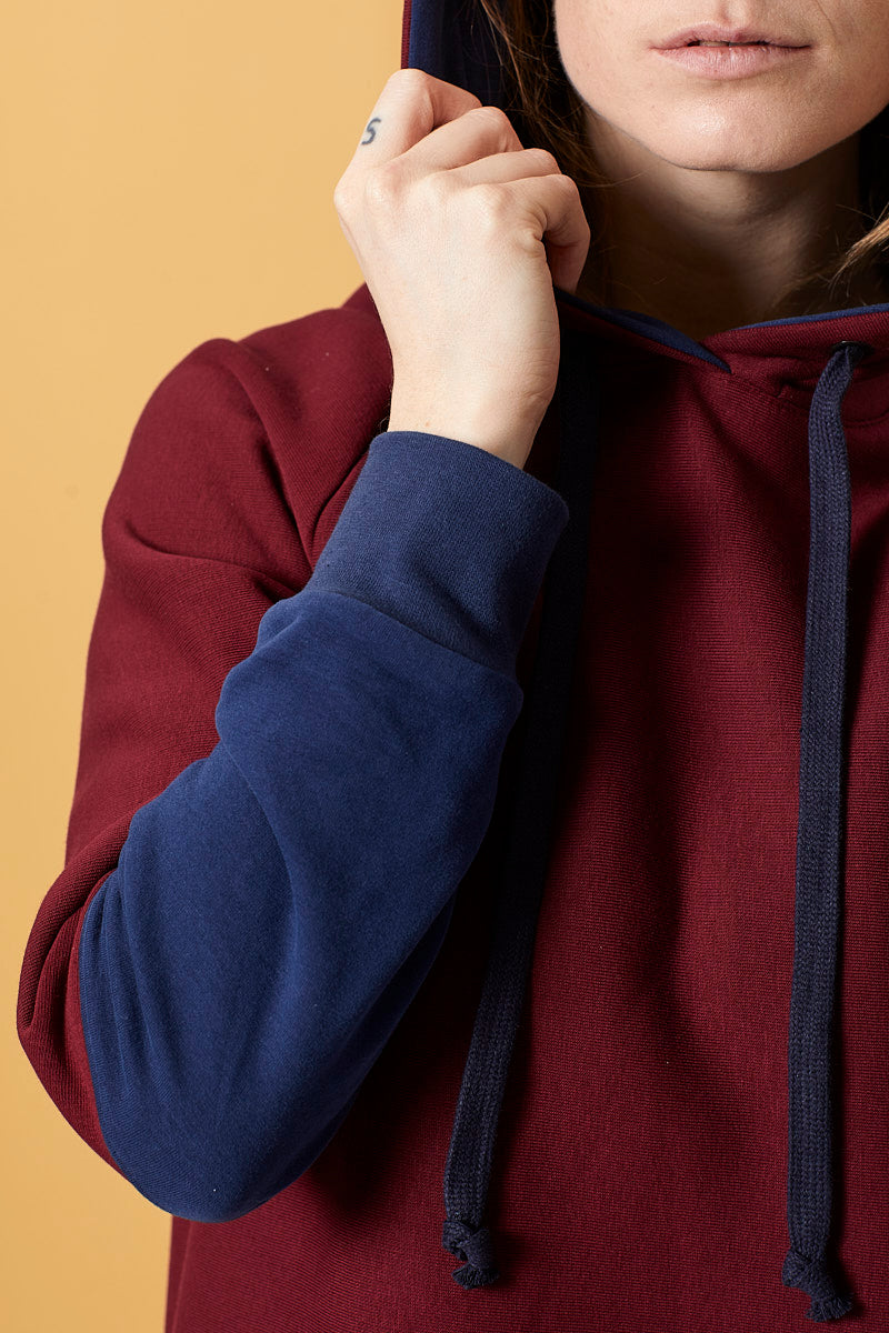 Lang block farvet blød hættetrøje i bordeaux og blå, med blå snøre.