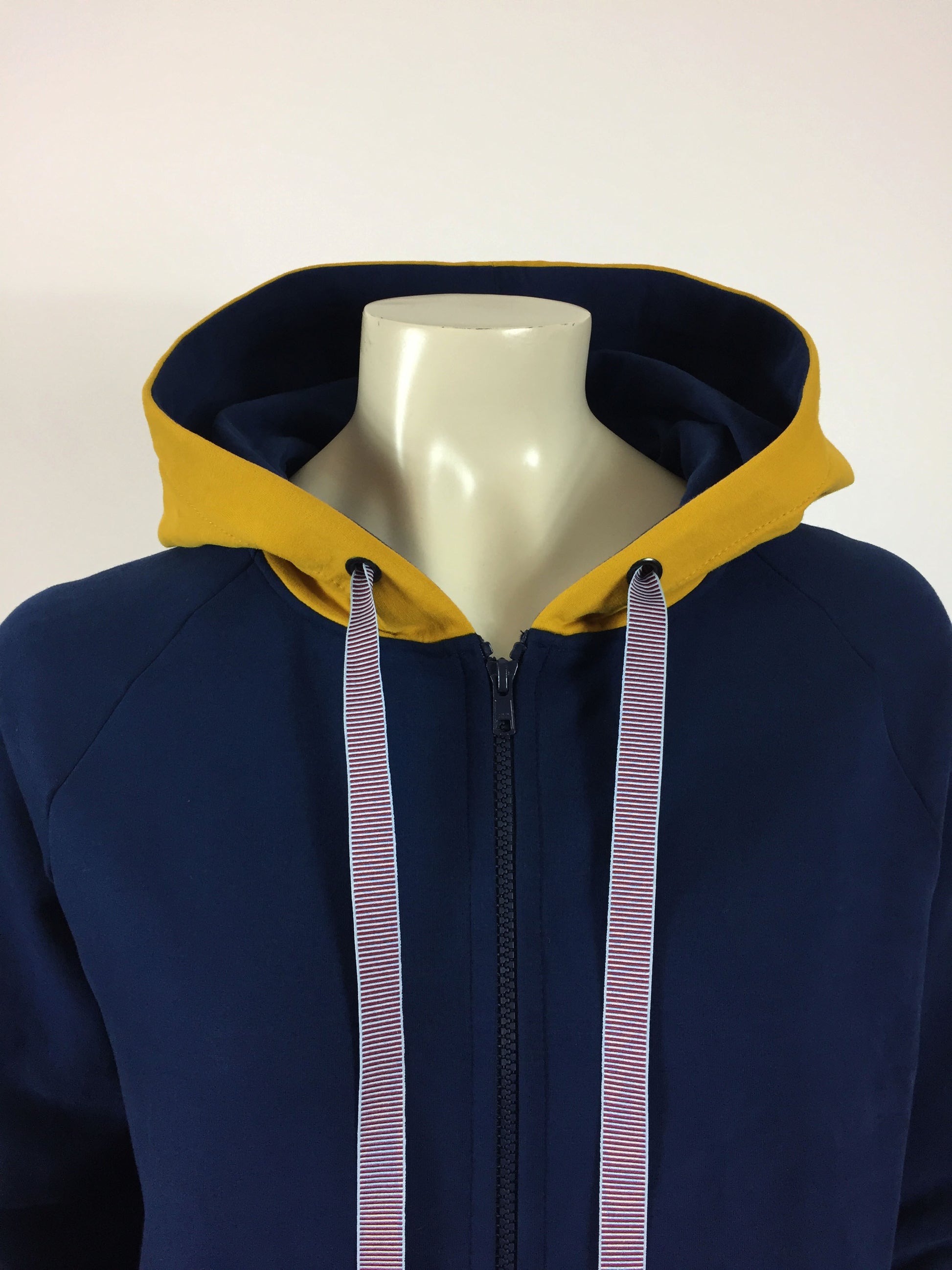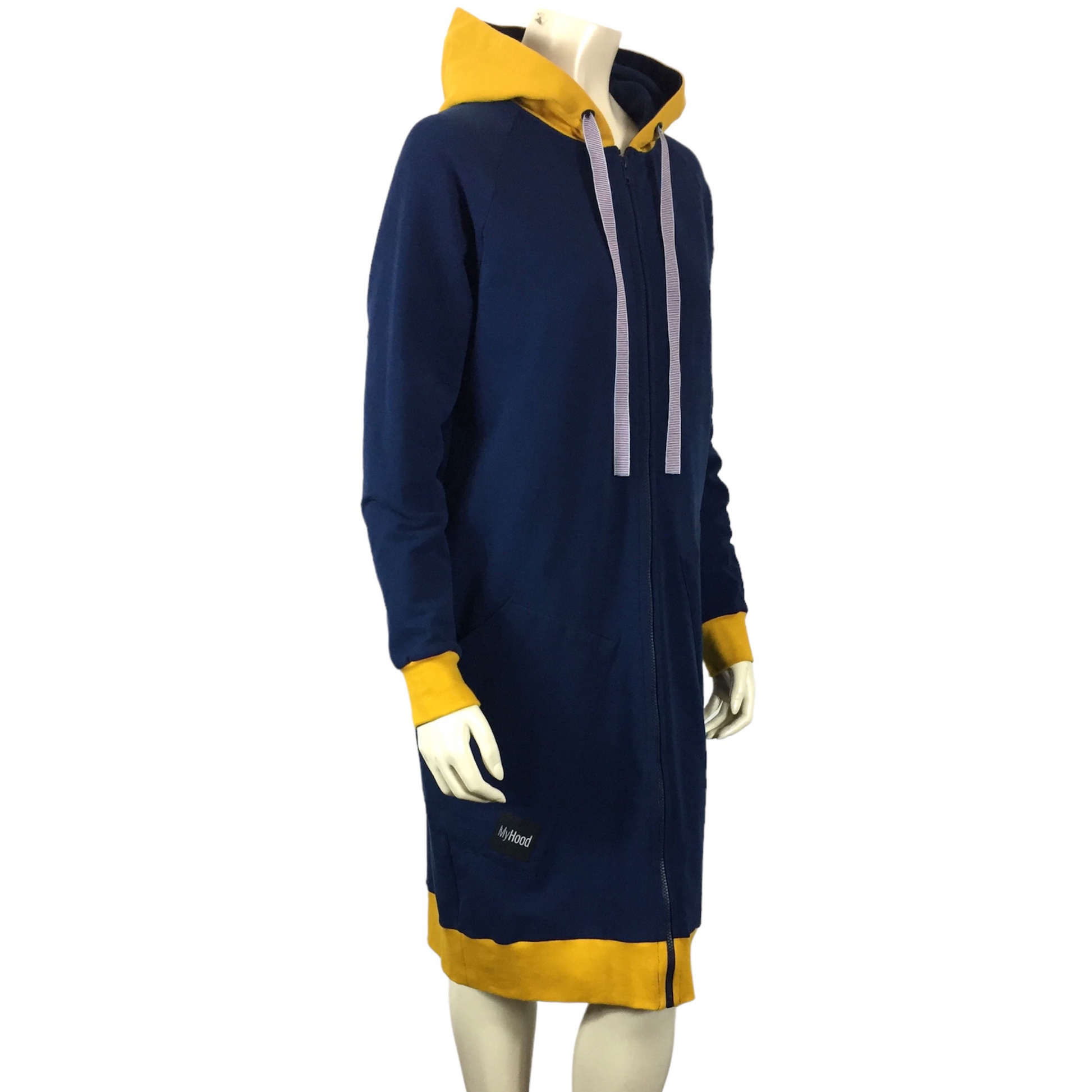Blå økologisk lang hættetrøje med lynlås, gule detaljer, asymmetriske lommer og stribet snører.
