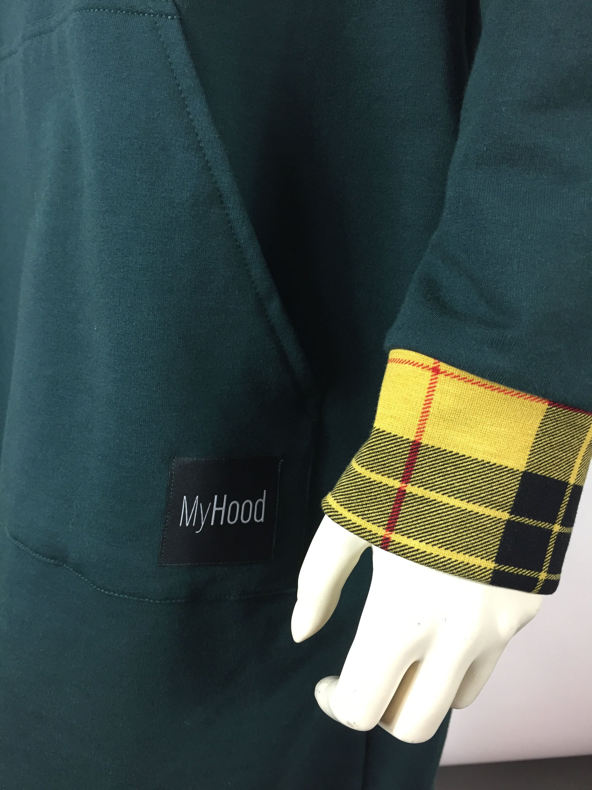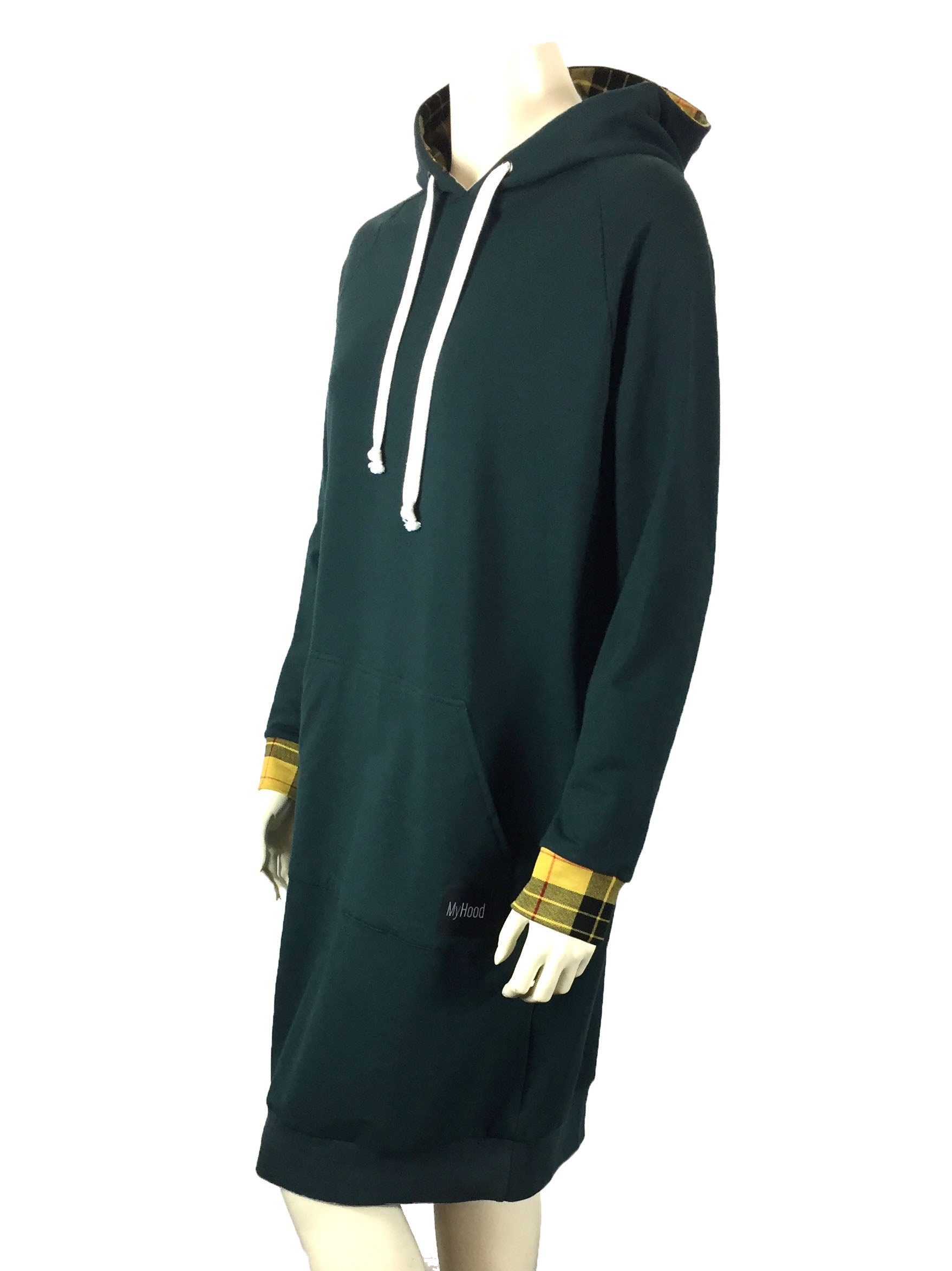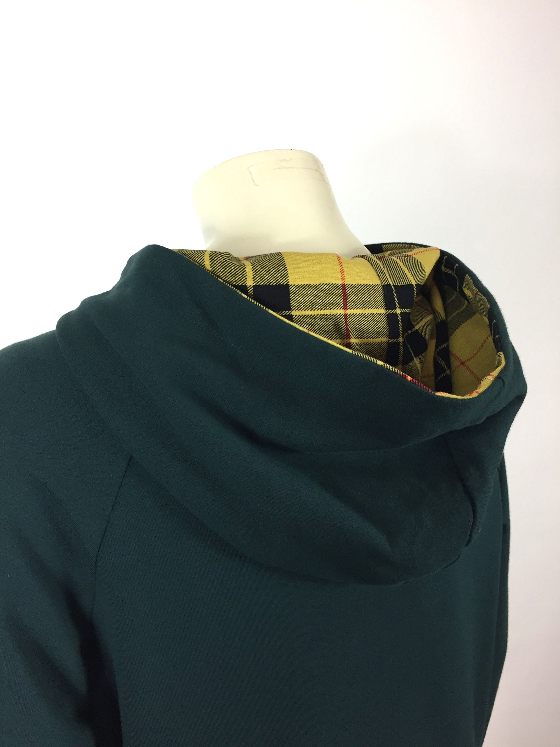 Lang grøn hættetrøje med ternede detaljer inden i hætten og med hvide snører.