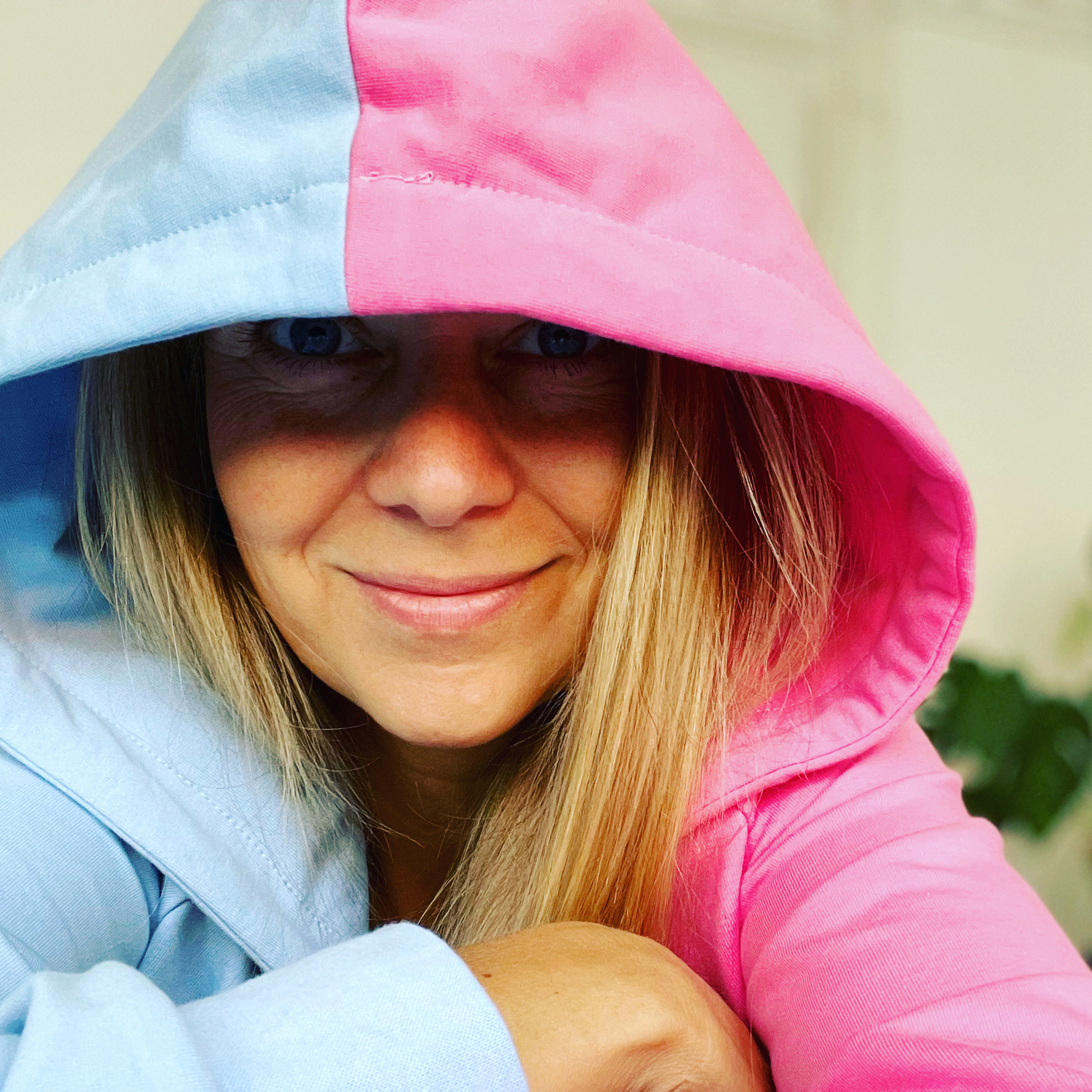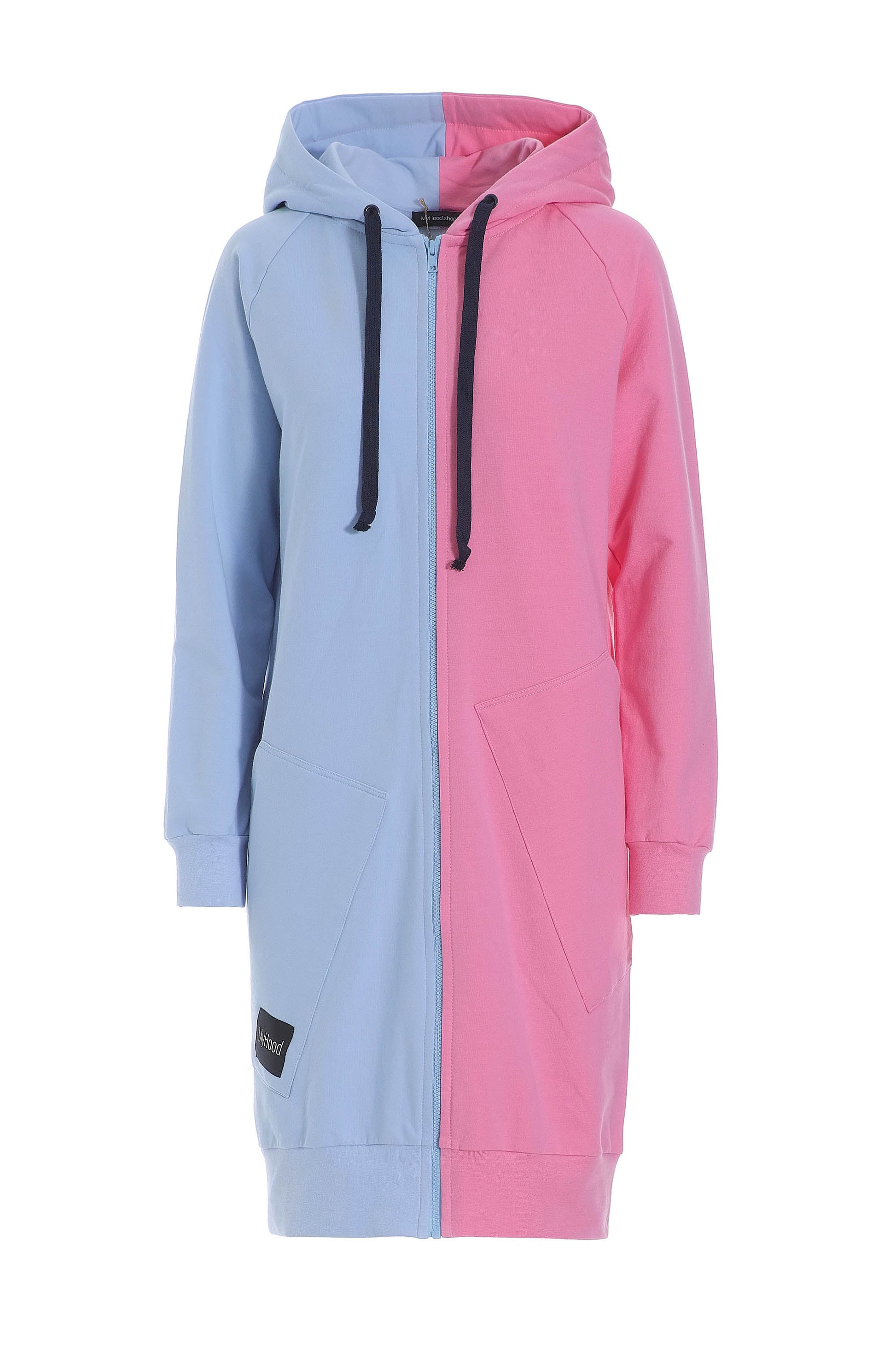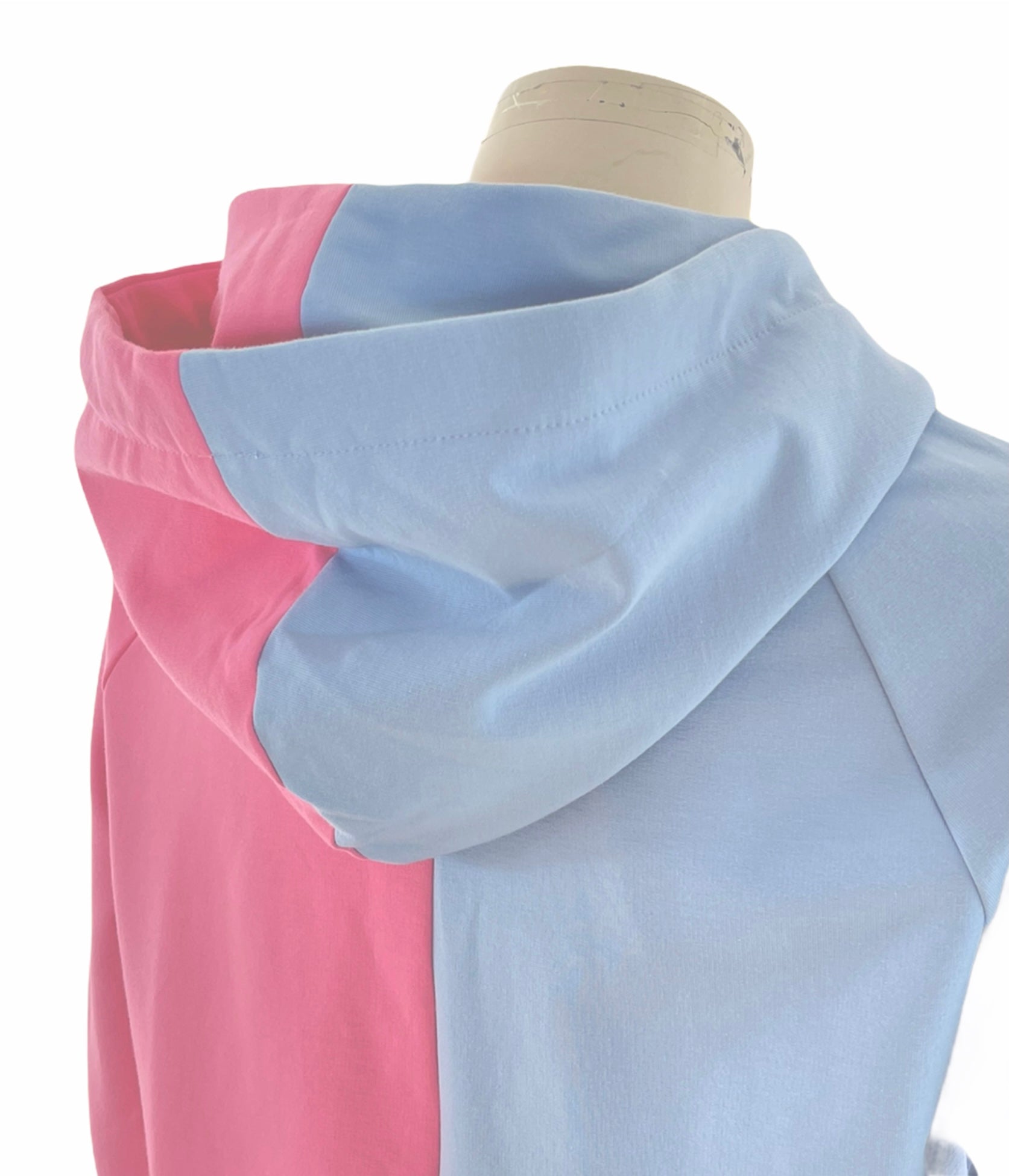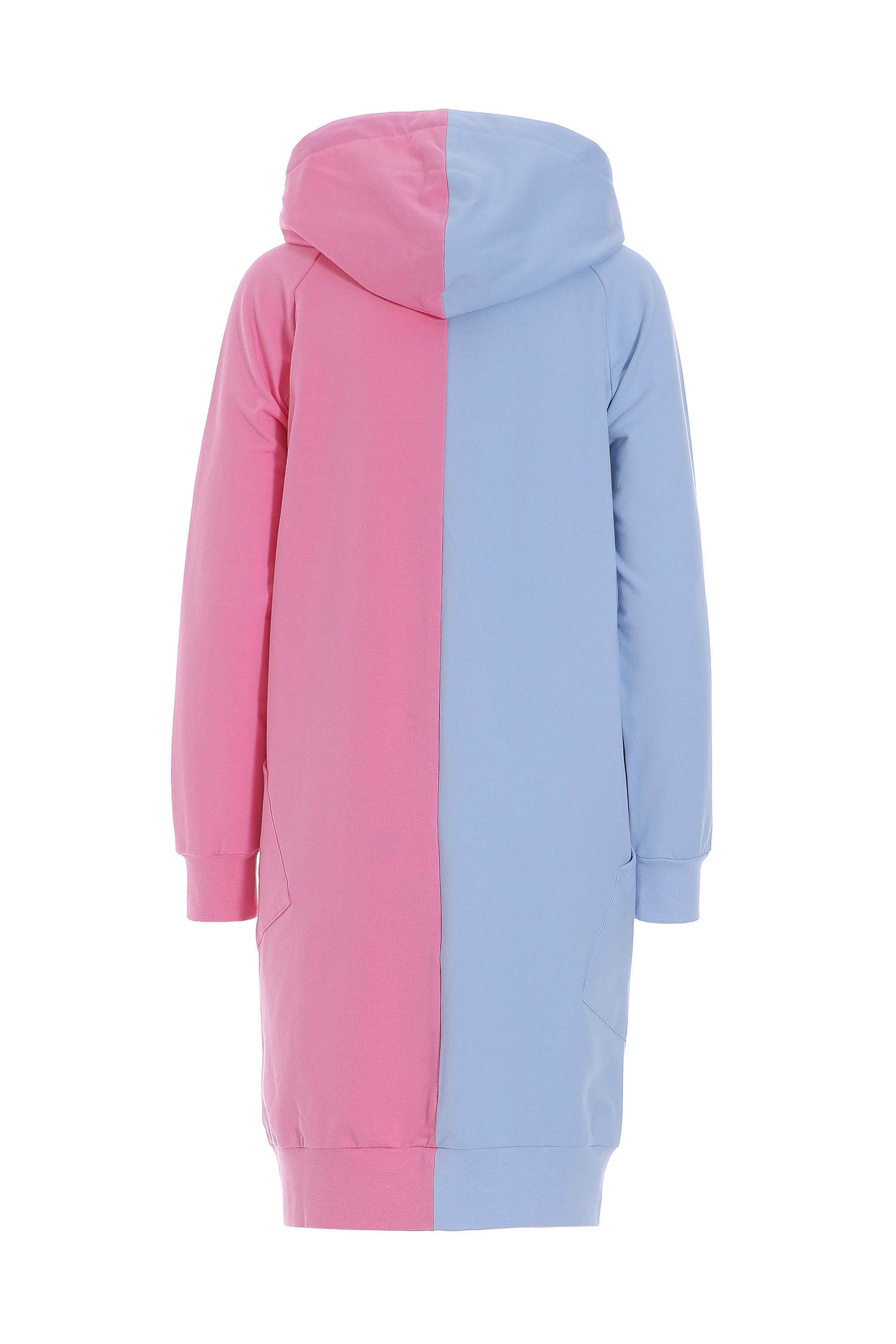 Lang blød farvebombe af en hættetrøje i lyseblå og lyserød. Med mørkeblå snører.