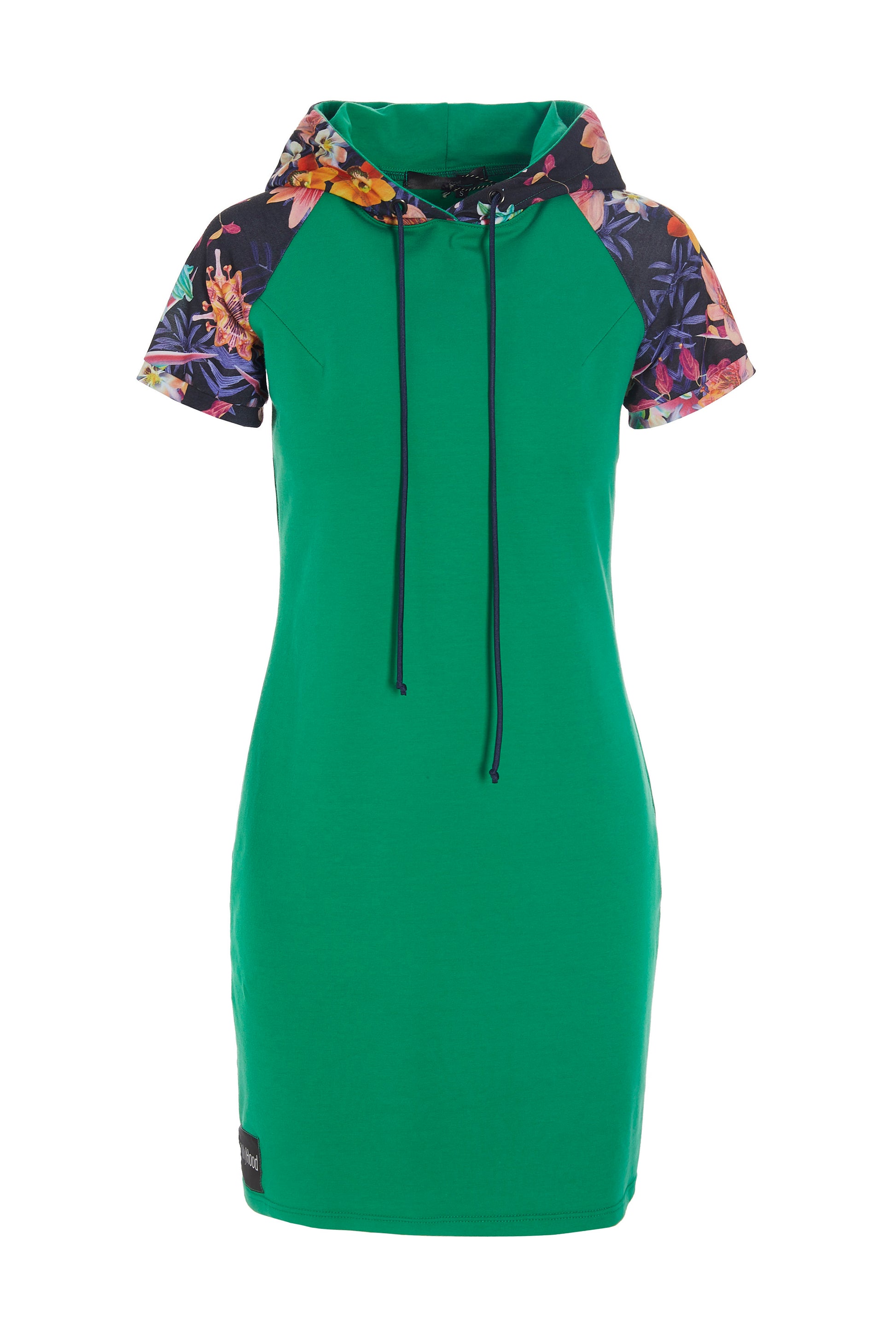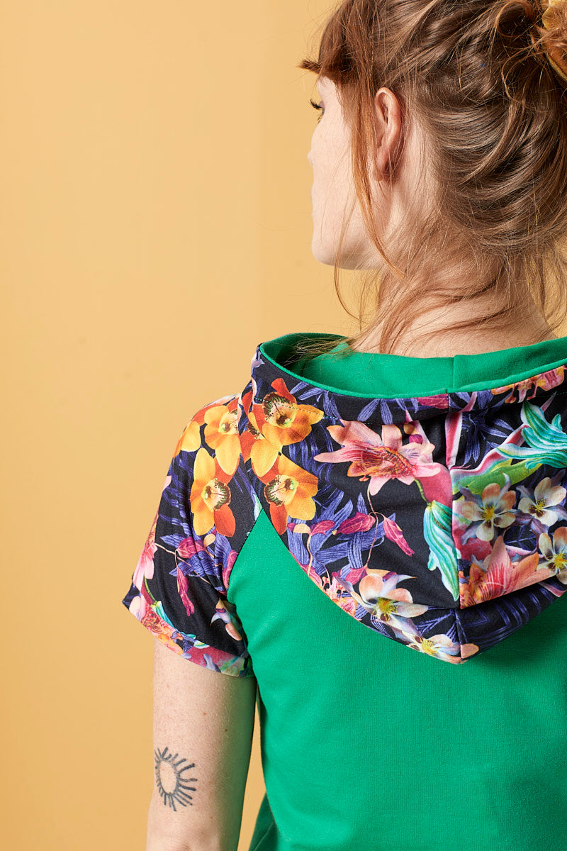 Grøn sommer hættekjole med blomsterprintede ærmer og mørkeblå snører.