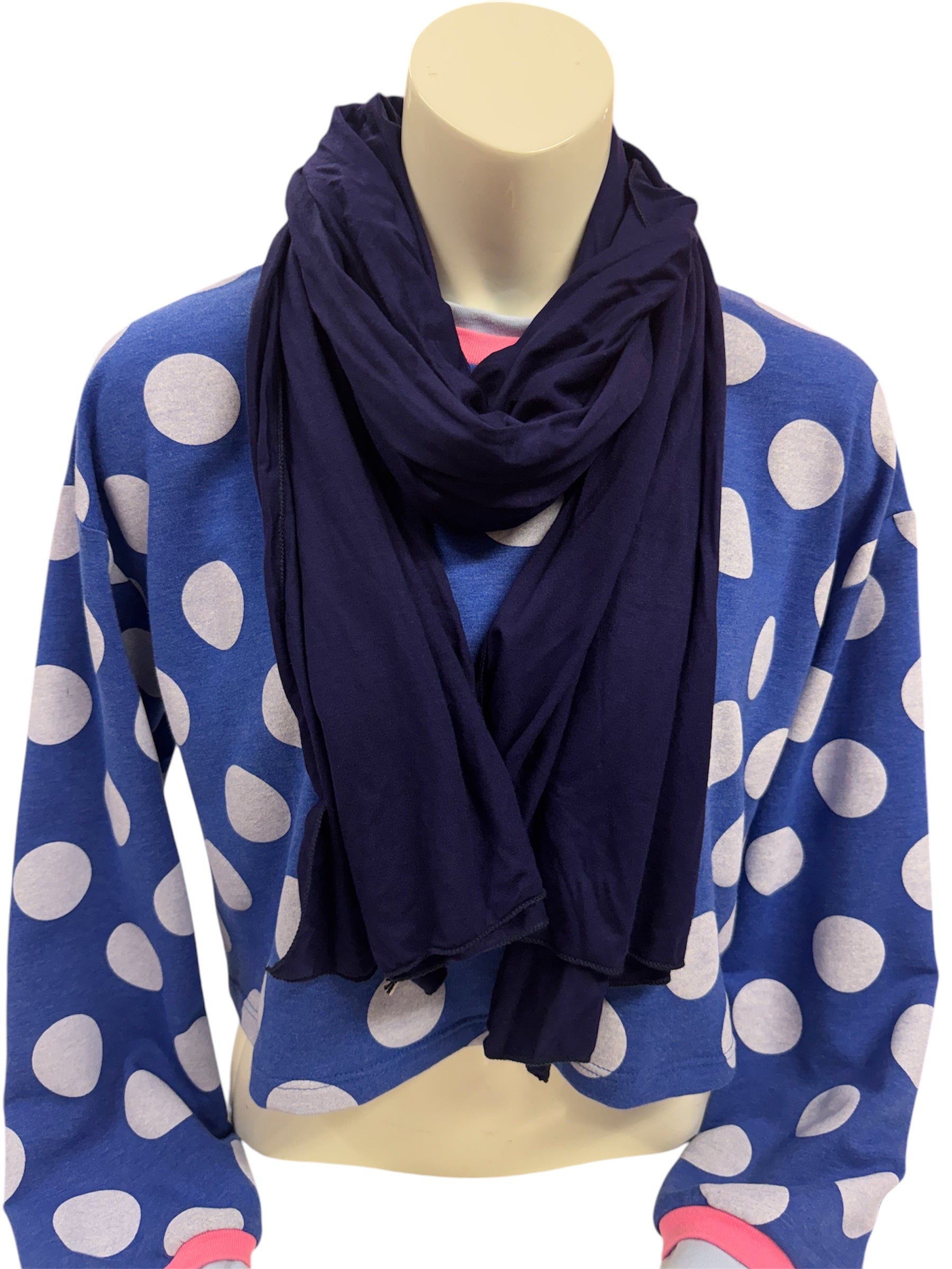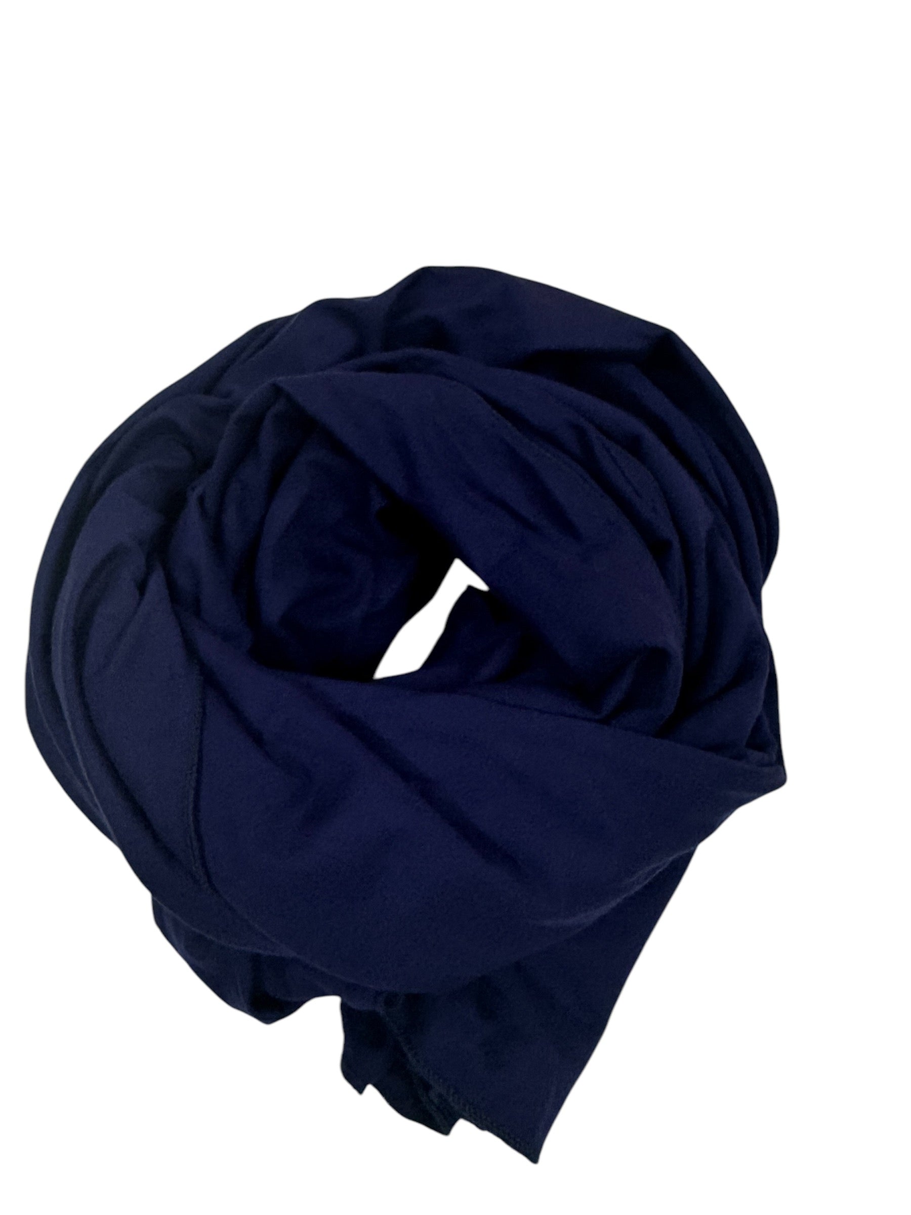 Smukt blålig-lilla tørklæde der falder blødt og tungt.