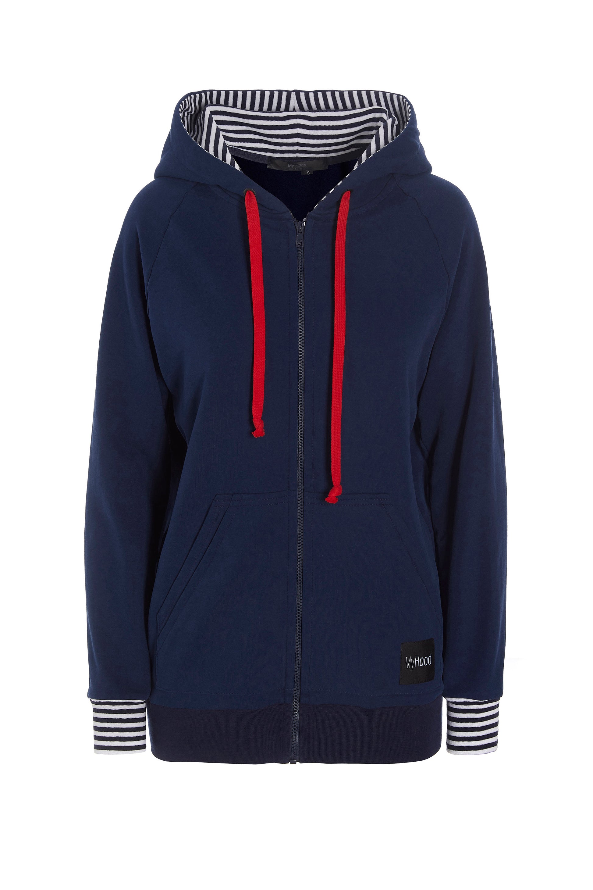 Blød økologisk unisex-hættetrøje med lynlås, signaturlomme og røde snører.